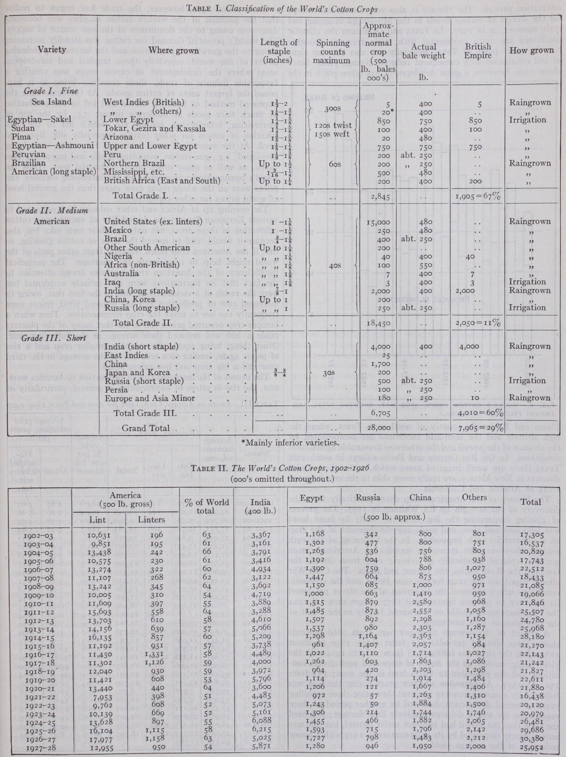 THE WORLD'S COTTON SUPPLIES The world's cotton supplies are so widely distributed and vary so greatly in quality and value that some principle of classifica tion is necessary to obtain a comprehensive and intelligible view of the supplies as a whole. From a manufacturing point of view the most convenient classification is according to the length of staple. On this principle all the world's cottons may be roughly classified into three main grades which may be called fine, medium and short staple ; and in Table I. the world's principal crops and many of the smaller ones are divided into these three grades with an indication of their staple length, the counts to which they will spin and their relative commercial values. It must be kept in view, however, that this classification is very uncertain and changes frequently. Some of the crops included in Grade I., e.g., Uganda, are very little better than the best varieties of Grade II. Again the division of certain crops between different grades is rather arbitrary and varies from season to season; e.g., the pro portion of the Brazilian crop which might be regarded as falling into Grade I., or the division of the Russian and Chinese crops between Grades II. and III. The table also indicates the propor tion of each grade grown in the British empire.