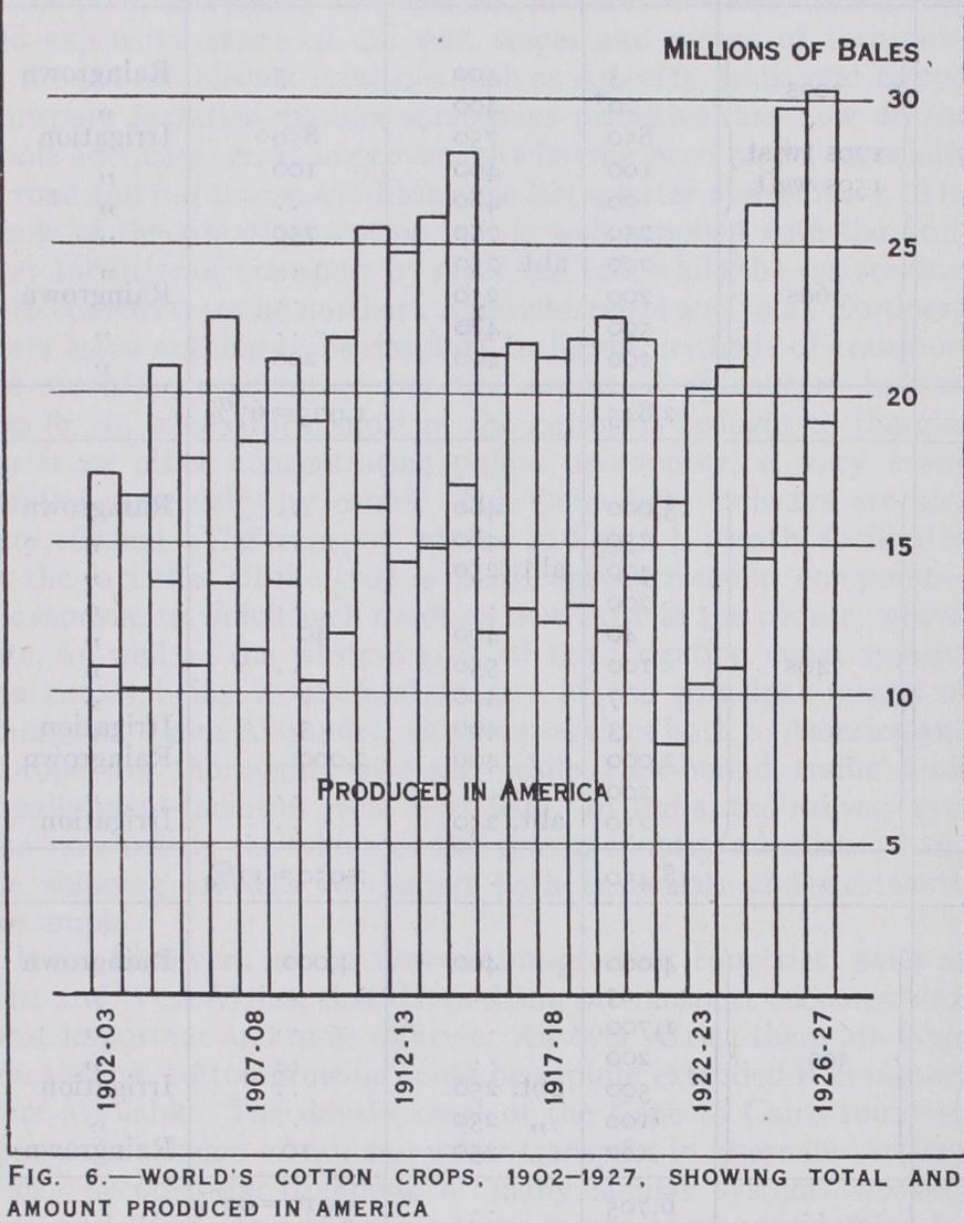 In 1927 the great bulk of the crop grown in the Sudan was of the Egyptian Sakel varieties and of very good quality, but in certain smaller districts on the River Nile American varieties had been found more suitable to the climate. In the far south of the Sudan there are also great possibilities for the development of rain-grown cotton where the climate again changes to monsoon type, but this will probably have to wait until the development of the irrigated districts has made further progress.