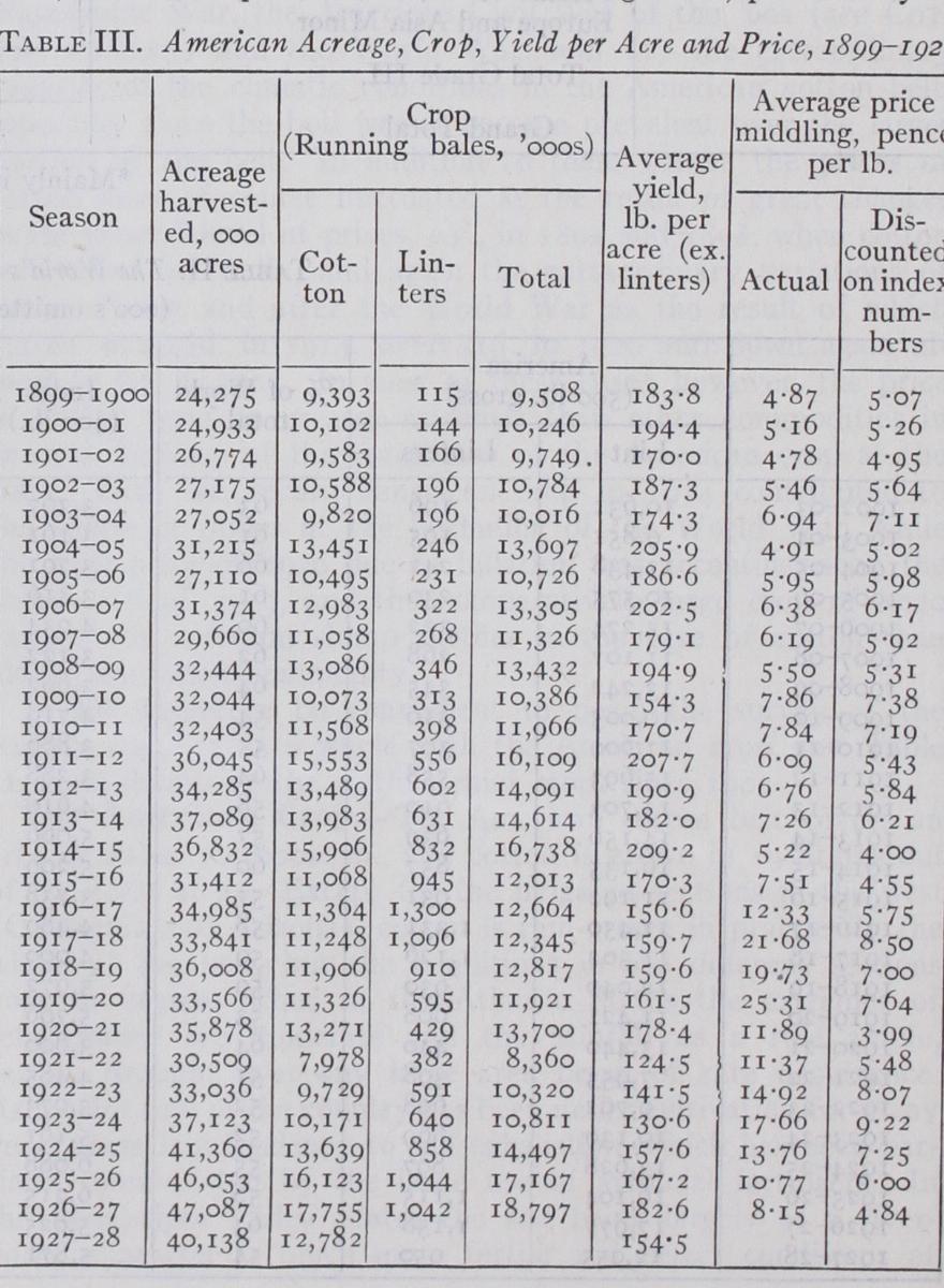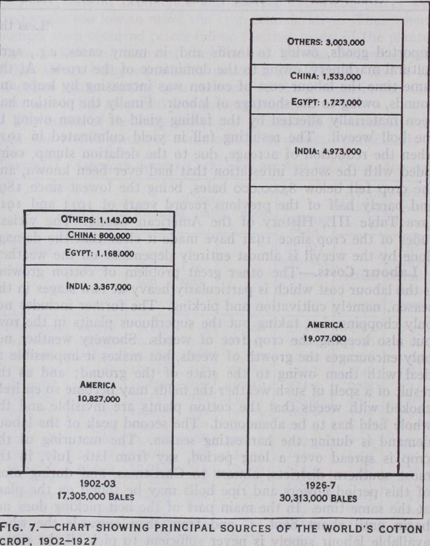The causes of the increased cost of production in America were, first, the rise in prices of commodities in general, particularly of imported goods, owing to tariffs and, in many cases, e.g., agri cultural machinery, owing to the dominance of the trusts. At the same time the labour cost of cotton was increasing by leaps and bounds, owing to the shortage of labour. Finally the position had been materially affected by the falling yield of cotton owing to the boll weevil. The resulting fall in yield culminated in 1921 when the reduction of acreage, due to the deflation slump, coin cided with the worst infestation that had ever been known, and the crop fell below 8,000,000 bales, being the lowest since 1895 and barely half of the previous record years of 1911 and 1914 (see Table III., History of the American Crop). The vicissi tudes of the crop since 1921 have made it clear that the damage done by the weevil is almost entirely dependent on the weather.