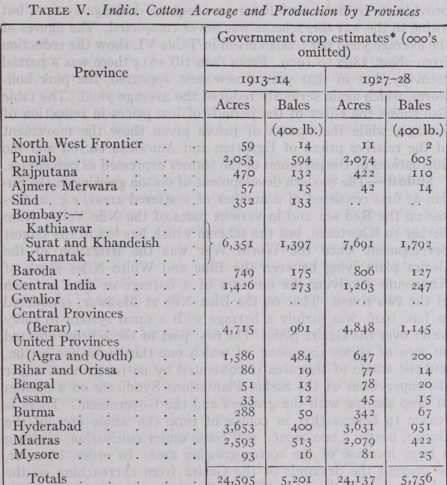 The cotton-growing areas in India are so widely spread and conditions vary so much from one province to another that space prohibits any description in detail, but Table V. shows the acreage and production by provinces.