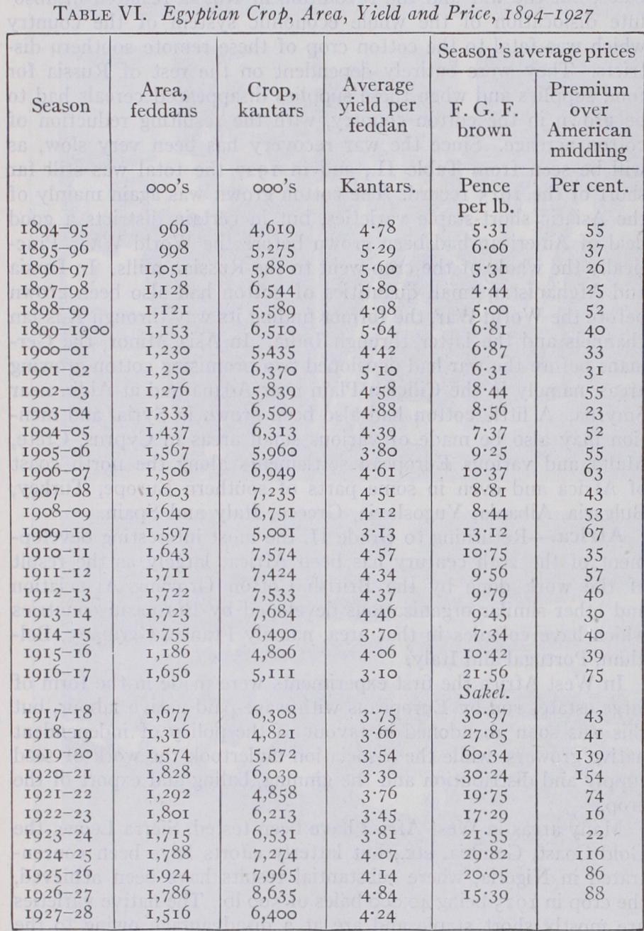As rainfall in Egypt is almost negligible except near the sea, cotton growing is entirely under irrigation. The history of the modern irrigation system dates from the introduction of the mod ern Egyptian cotton about 182o. At that time the system was entirely what is known as "basin" irrigation, under which the whole cultivable area was divided into great basins of about 40,000 acres each divided off by great earthen banks, and into these the flood waters were carried by short canals producing complete sub mersion during the period of the flood, after which the water was run off again as the level in the main channel of the Nile fell. This system, however, rendered cotton growing impossible and "perennial" irrigation was introduced under which a limited supply is given throughout the whole year. The history of the modern irrigation system may be divided into three periods : (I) up to 1885 when the great barrage at the bifurcation of the two branches of the Nile just below Cairo (which had been begun under Mohammed Ali in 1842) was repaired and completed by British engineers; this rendered possible the full utilization of the natural supply in the Nile ; (2) the next stage was the erection of the Aswan Dam completed in 1902, a great storage reservoir which is filled at the close of the flood and held until the following spring, when it is doled out through the summer by the system of "rotations" to maintain the level of the river and the great canals leading from the barrage. Other barrages were also erected at Esna and Assiut to feed similar canal systems in Upper Egypt and at Zifta on the Damietta branch below the Cairo barrage to feed a supplementary system of canals in the Delta ; (3) the addi tional supply thus provided having proved insufficient the Aswan Dam was raised in 1912. In the meantime the extension of per ennial irrigation and the increase of the supply, accompanied by an insufficient provision of drainage, had raised the subsoil water table in the lower parts of the Delta and in 19o9 a peculiar com bination of flood conditions brought matters to a head and caused colossal damage to the crop of that year. After prolonged con troversy a great scheme was inaugurated by Lord Kitchener to remedy the lack of drainage by enclosing and pumping out the great salt lakes along the Mediterranean coast, which would then provide an artificial outfall for an adequate drainage system, but owing to the war this scheme was never completed. The figures of the average yield per feddan given in Table VI. show the reduction from about 1897 to 1909. From then till 1913 there was a partial recovery, but in that year a new pest appeared, the pink boll worm, which again seriously reduced the average yield. The table also shows the effect of the periods of low prices in reduction of acreage, while the figures of prices given show the movement of the relative prices of Egyptian and American cotton and the fluctuations of the premium of the former expressed as percentage.