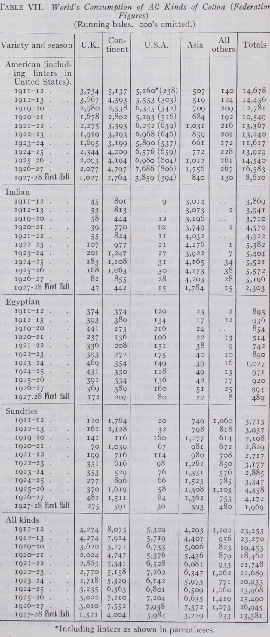 In the case of those countries which do not produce cotton, such as Great Britain, the corresponding method of taking the imports less re-exports and allowing for stocks should be a good guide to consumption ; but again the stocks in mills as well as at the ports and in warehouses must be arrived at, and that can only be done by direct computation. The compilation of statistics of stocks at ports and in warehouses is fairly easy, but the com pilation of mill stocks could not be undertaken until the estab lishment of the International Federation of Master Cotton Spin ners' and Manufacturers' Associations provided an organization which represented the bulk of the cotton mills in every important cotton-spinning country throughout the world except America. From 1905 the federation published half-yearly statistics of mill stocks. In the United States the Census Bureau of the Depart ment of Commerce has for many years published statistics of stocks in public warehouses and in consuming establishments at the end of each season and these have been issued monthly since 1912. By incorporating the Census Bureau figures in their own returns the International Federation secures almost complete returns of stocks and consumption half yearly. Thus the feder ation figures are an essential part of any calculation of consump tion. Either their figures of consumption may be taken straight, or their figures of the stocks may be taken along with imports and exports to arrive at a calculated figure of the consumption. The former method is the more direct and probably on the whole the more reliable. The doubtful factor in the federation figures is that in some countries the actual returns received from the mills fall rather far short of the total. In the United States of course this does not apply because the returns are compulsory, and in countries like England and most Continental countries where the organization of the trade is good the percentage of actual returns is very high. To get the total figures the federa tion calculates by simple proportion, on the assumption that the spindles not returning will have consumed the same quantity of cotton as those that did make returns and that the quantity would be distributed in the same proportion over the different varieties. This assumption of course leaves room for a considerable error at times, especially in the distribution between different varieties, but it is believed that the error is on the whole not large and that it is not likely to vary much from one year to another.
