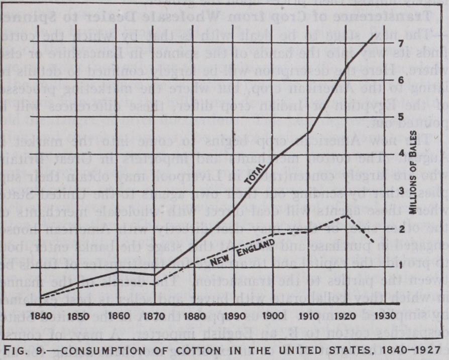 Important as is the material collection of each annual cotton crop at the network of small markets and finally within a smaller number of larger spot markets the second process, in the final disposal of the crop, is even more important in the determination of the price at which cotton will ultimately find its way into the hands of the spinner. This is the set of transactions which takes place upon the organized cotton markets in the world—Liverpool, New York, Alexandria, New Orleans and Chicago—where wide spread dealings in future contracts in effect create one market for cotton with prices from hour to hour reacting sympathetically in every country in the world. Lest this division of the subject which has been made into local marketing and the transactions of the large future markets cause misunderstanding it ought to be made clear that the two processes do not necessarily succeed each other chronologically. Contracts for the future delivery of cotton may, of course, be made, either on or off exchanges for very many months in advance and, in the big exchanges, a regular commerce exists in such contracts relating to each of the succeeding 12 months. The crop, in effect, is being bought and sold and its probable quality and quantity influencing existing prices long be fore it arrives at the local market. But for more detailed descrip tion it is necessary to consider each important growing country in turn.