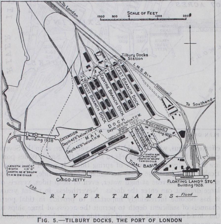 A channel carried across an estuary to deep water requires con stant dredging to maintain its depth. In large tidal rivers and estuaries, therefore, docks should be placed alongside a concave bank which the deep navigable channel hugs, as effected at Hull and Antwerp; or close to a permanently deep channel in an estuary, such as chosen for Garston and the entrance to the Manchester ship canal at Eastham in the inner Mersey estuary, and for the Grimsby and Immingham docks in the Humber. Occasionally, extensive draining works and dredging have to be executed to form an adequately deep channel through a shifting estuary and shallow river, as, for instance, on the Weser to Bremer haven and Bremen; on the Seine to Honfleur and Rouen; and on the Tees to Middlesborough and Stockton (see RIVER ENGINEER ING).