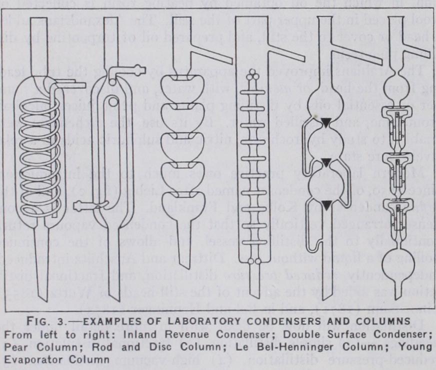 Numerous columns have been devised, but all work on the principle of allowing the more volatile portion of the vapour to proceed to the condenser whilst returning the less volatile to the still. Of the three main types, the plain column, of which the Wurtz bulb and the Young pear columns are modifications, is the least efficient. The second class of column is maintained at the temperature at which the most volatile constituent of the vapour distils. The third type, better known as the dephlegmator type, is the most widely used. In this the ascending vapours from the still bubble through portions of the already condensed vapour. The Linnemann modification passes the vapour through condensate temporarily collected on platinum gauzes at constrictions in the column. The le Bel–Henninger embodies a further development of the idea, and successive bulbs are connected by syphons (fig. 3). The Young rod and disc, the Hempel glass bead, the Raschig and the Lessing rings and the Young evaporator columns are all exten sions of the same principle. Duf ton 0919) has devised a very simple column which consists of a wire wound spirally in the an nular space between a closed centre member and the outer column body. It is simple to construct, efficient in operation and is essen tially a laboratory adaptation of the commercial column due to Foucar.