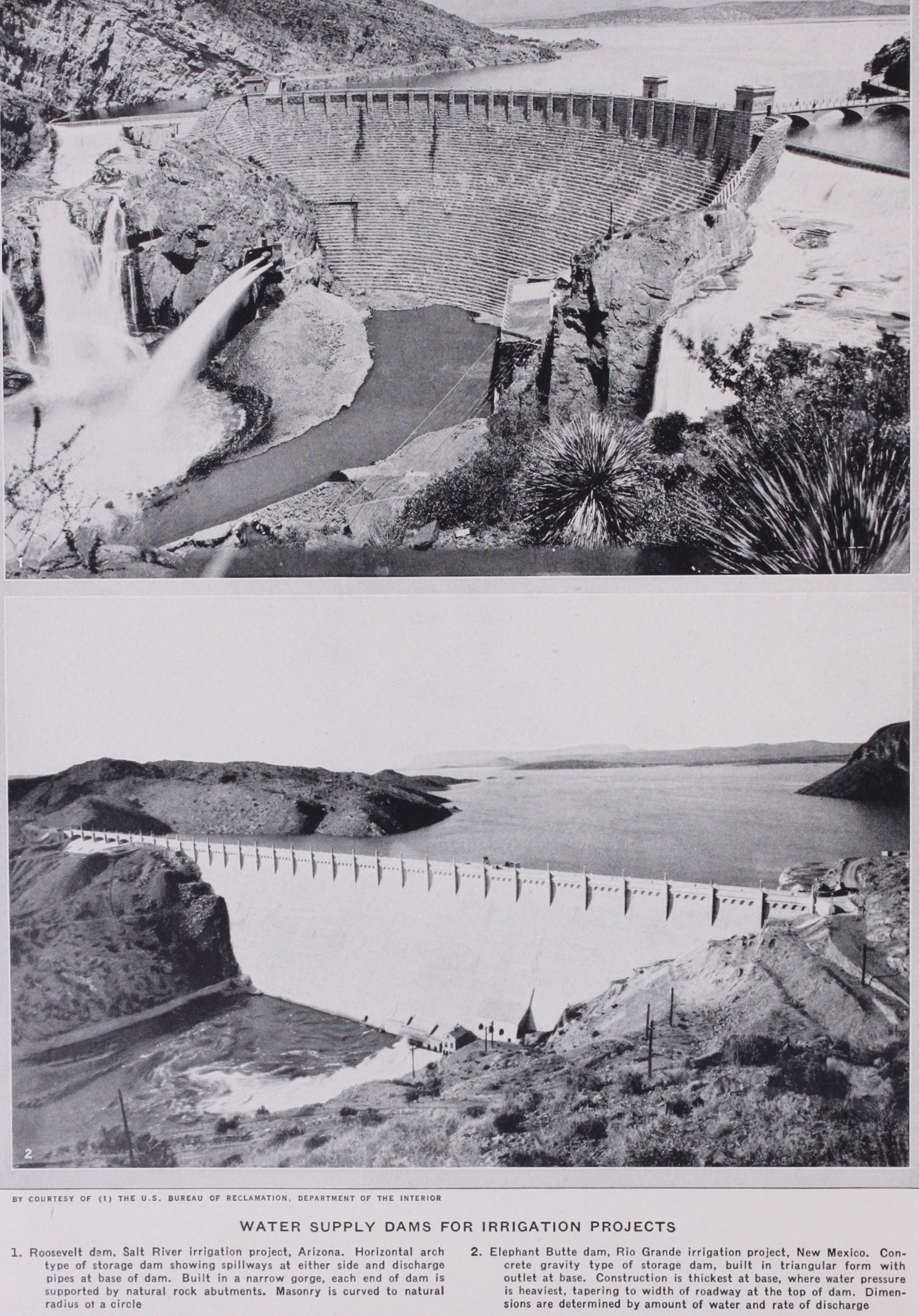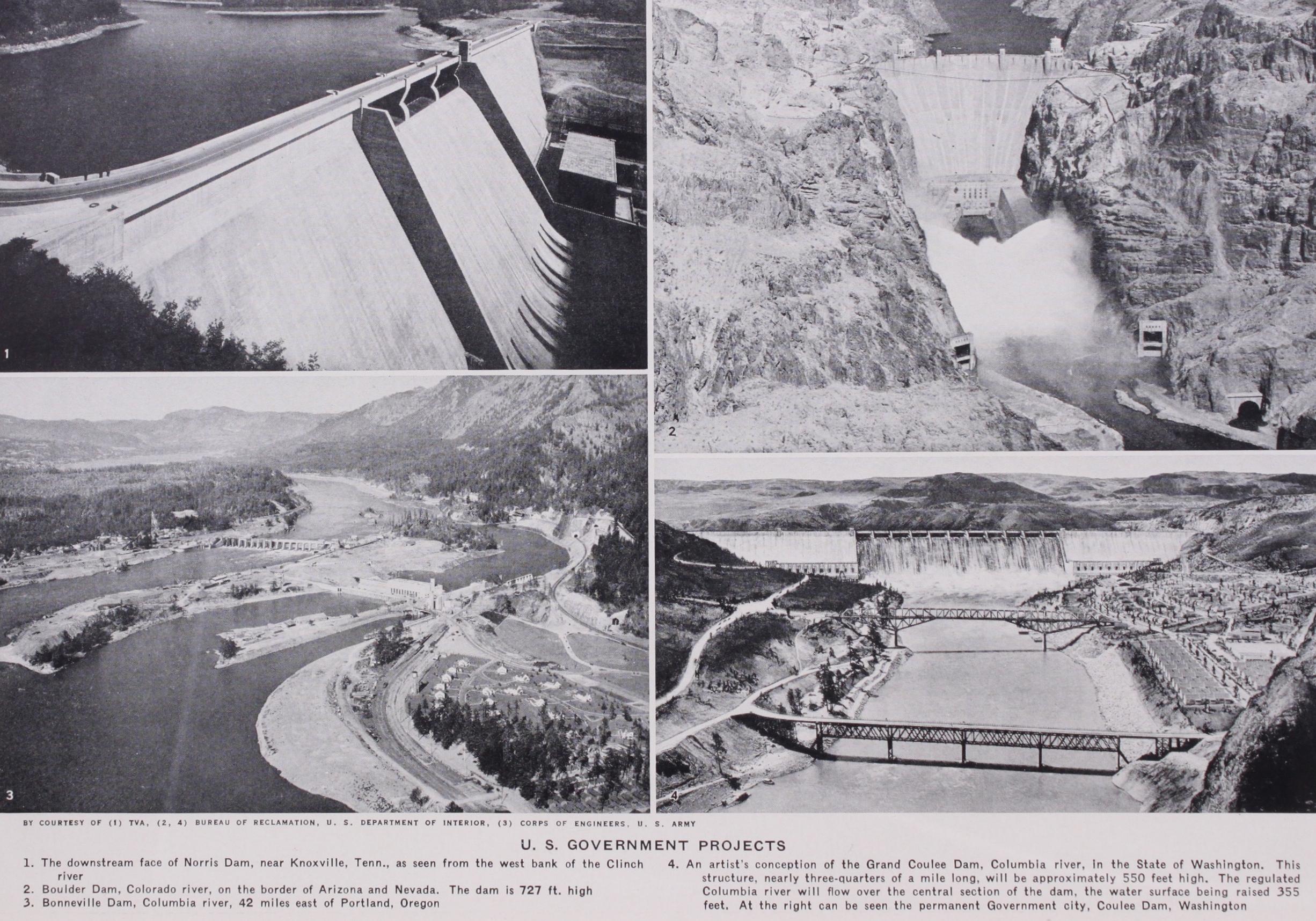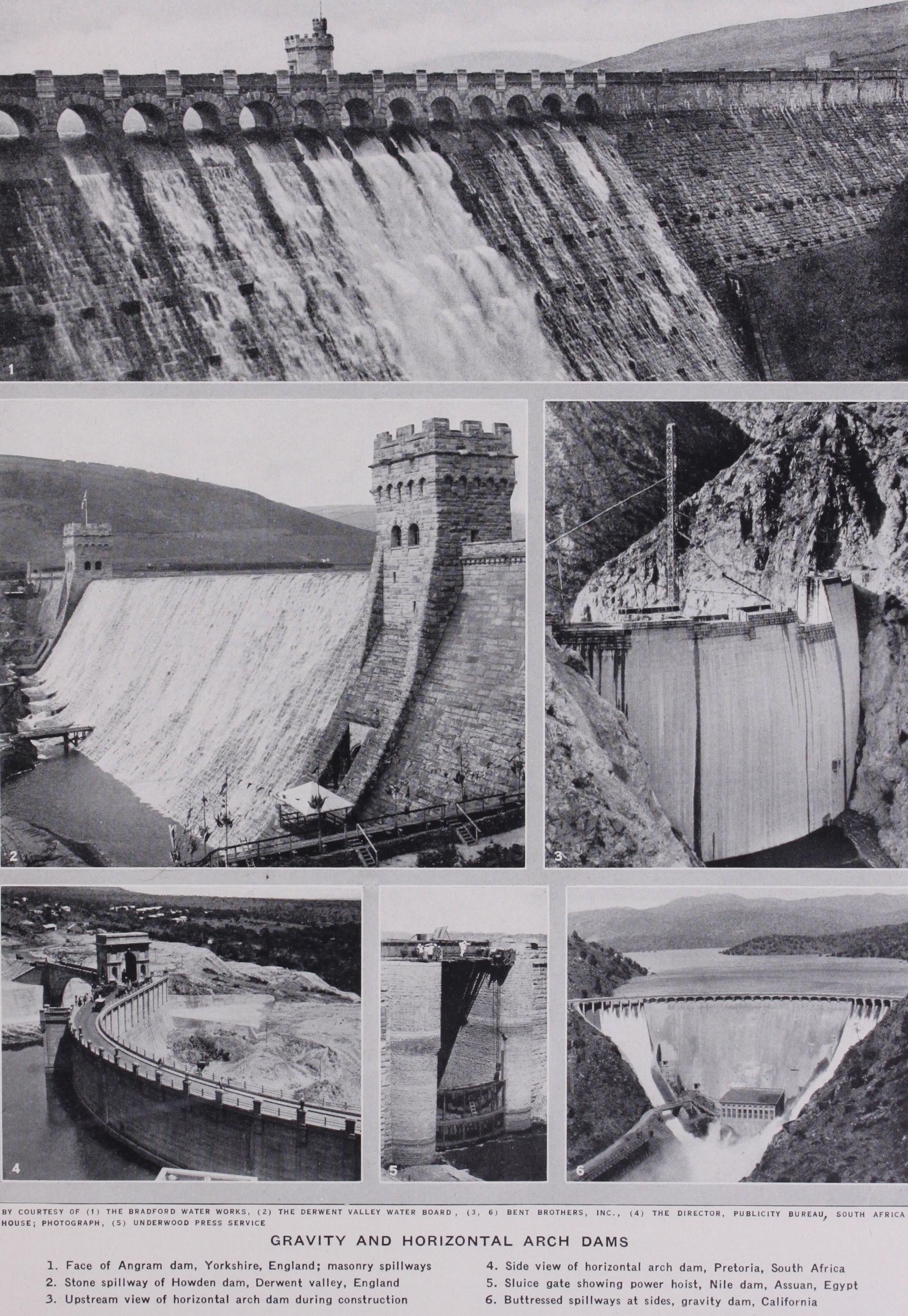 (J. WI.; W. P. C.) Boulder Dam.—Harnessing one of the world's great sources of hydro-electric power, the Colorado river, Boulder dam towers 727ft. above the canyon floor, the highest dam in the world. Originally proposed as a concrete horizontal arch, the dam was finally built as a solid concrete gravity type curved in plan. Its crest length is 1,282ft. and it contains 3,241,553 cu.yd. of concrete. The great size of the dam required that it be built in vertical blocks rather than as one solid mass. One of the problems in constructing such large masses of concrete was the dissipation of the heat generated by the hydration of the cement in order to prevent any large amount of expansion and contraction after the concrete had taken its initial set. For this purpose more than 57omi. of in. tubing were buried in the concrete and refrigerated water pumped through them.