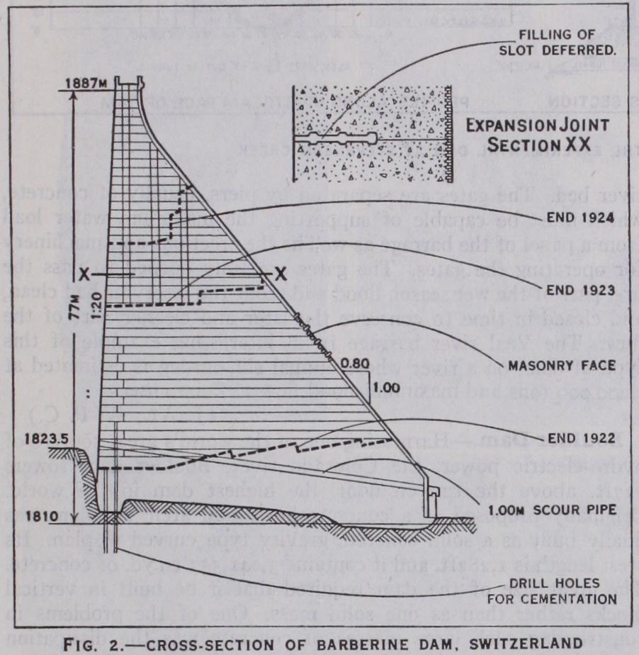 The Barberine dam in Switzerland, completed 1925, and shown in cross section in fig. 2 illustrates the application of the triangular form, together with excellent arrangements for sealing the base by cement grouting in drill holes, and for providing for ex pansion and shrinkage in the upper part. The dam is of concrete with mixtures varying from 250 to 30o kg. of cement per cu.m., is without drainage arrangements and is designed for water uplift on the base varying from full-head at the inside to zero at the outside. The slope of the waterface is 1:2o and of the outer face o.80:1. The section indicates an infrequent masonry facing of gneiss applied on the outer slope, which has a southern exposure and is subject to severe temperature variations.