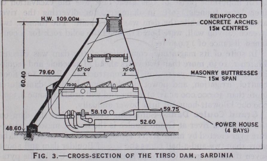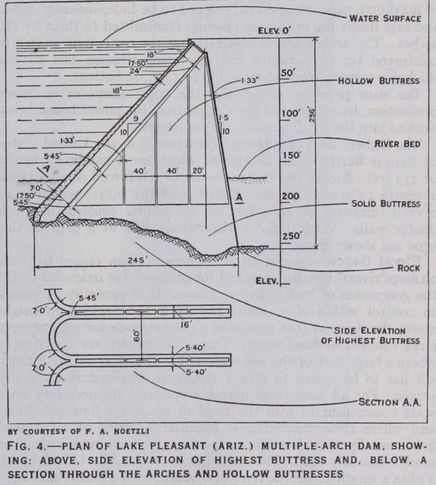 The highest dam of this type constructed in the United States to 194o is Bartlett dam in Arizona which has a maximum height of 273 feet. Arches and buttresses are of reinforced concrete with a centre to centre spacing of 6oft. and the buttresses have an overall thickness of 22ft. but are of cellular construction with double walls. Vertical and horizontal sections of a dam of this type are shown in fig. 4.