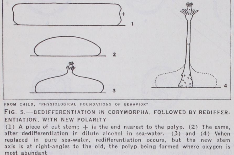 In lower types, the fate of differentiating organs is largely determined by the space able to the emigrating cells, e.g., in colonial Hydroids, such as Obelia, when exposed to favourable conditions, the polyps start to dedifferentiate as does Hydra; but the large spaces of the less susceptible stalk are able for the cells migrating out of the tissues, and accordingly the polyps become entirely resorbed into the stem. The same is true in the social Ascidian Perophora. In both cases the amount of stalk or stolon left attached to an individual (zooid) determines the final result. If the amount of stalk is relatively large, total sorption occurs. If small, the result is a dedifferentiated zooid. One particularly interesting point has been elicited by Child. By applying depressant agents such as weak alcohol to pieces of Hydroid stems (Corymorpha) he obtained dedifferentiation which led to complete obliteration of the original polarity. On being replaced in sea water, regeneration took place, but at right angles to the direction it would have taken if no dedifferen tiation had occurred.