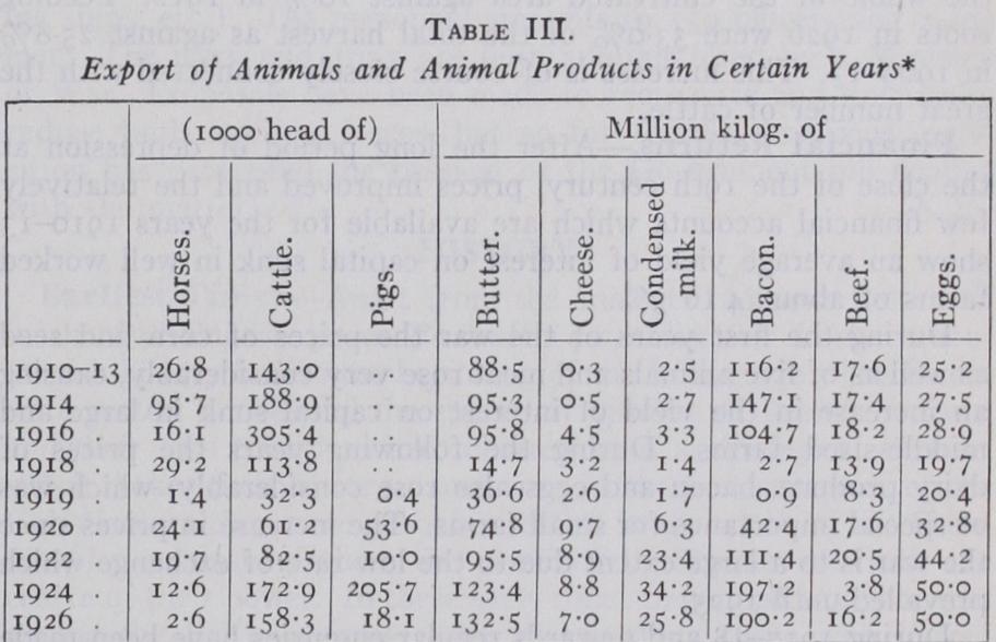 The heavy reduction after 1917 was mainly due to the absolute cessation of the import of feeding stuffs, but partly to the very poor harvests during the years 1917-18 especially with regard to grain crops. These reduced the bacon export in 1919 to the mini-, mum of i,000,000 kilogrammes. The export of animal products only reached pre-war level in 1923 and 1924. The increase is largest for the export of dairy produce, pigs, bacon and eggs, while the export of cattle and beef taken as a whole is about the same as before the war and there is a considerable decrease in the export of horses mainly due to difficulties experienced on the German market.