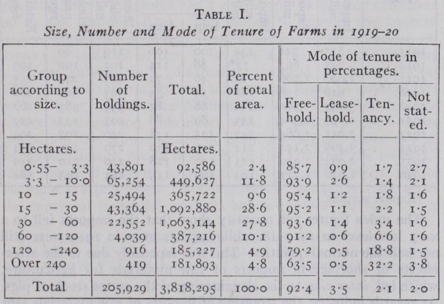 It will be seen that the middle-sized farms of from 1 o to 6o hectares form the majority, comprising 66% of the total area. The small holdings of under io hectares form 14% and the farms of above 6o hectares form about 2o%. In 1919 only 5.7% of all the farms were not worked by the owners as against 11.6% in the year 1901.