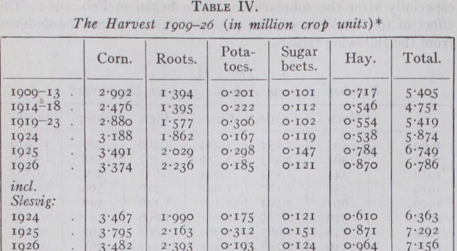 The above statistics do not include the yield of the grazing and green fodder area nor the yield of various crops grown for the pur pose of commercial transactions. If these crops are also included the total production of 1926 will be about 9,300,00o crop units including Slesvig. The decrease during the World War is specially noticeable with regard to the corn and hay crop but it is partly due to a decrease in the arable area of these crops, while the area of roots, potatoes and sugar beets was greatly increased during the same period, and this increase in roots continued after the war so that the area under these crops in 1927 was about 13.8% of the whole of the cultivated area against io% in 1912. Feeding roots in 1926 were 33.o% of the total harvest as against 25.8% in 1909-13. This increase is of course closely connected with the great number of cattle.