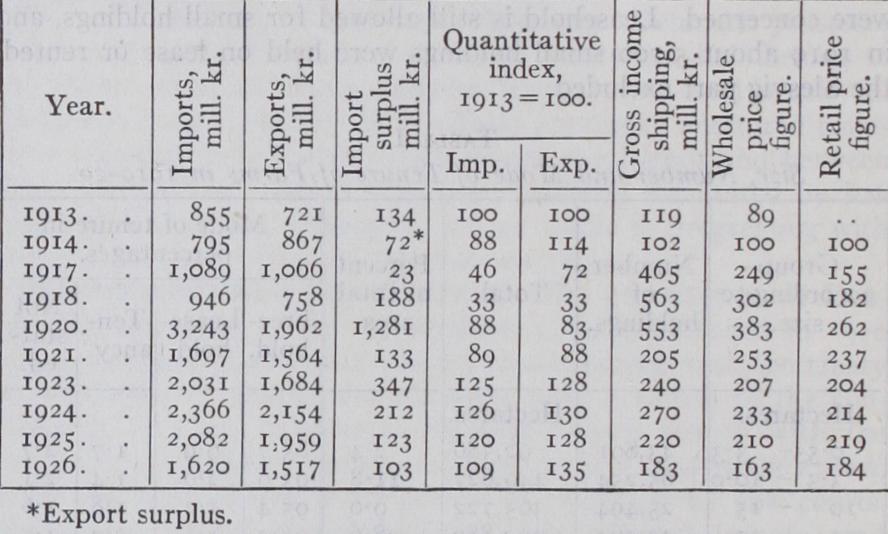 The table further shows that imports were only slightly in excess of exports during the actual years of war, and this excess was more than balanced by the income derived from shipping. In 1919-2o, on the other hand, the excess was very high, partly be cause quantities of goods purchased during the war could now be brought home, and partly because of the anticipation of a great demand from Central Europe and the Baltic which, however, failed to materialize.