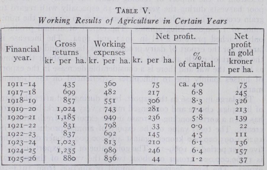 The heavy deflation and the following decrease in the world market prices of agricultural products have involved very difficult times for Danish agriculture as the decrease in a great number of the working expenses (wages, costs of repairs, etc.) has not been able to keep pace with the decrease in prices of agricultural prod ucts. During the first year, however, bacon kept tolerably good prices and, besides, the harvest in 1925 was beyond the average, so that the result of the year 1925-26 was not as bad as that of the year 1921-22. Later the prices of bacon dropped violently, and this in connection with the bad harvest in 1927 further deteriorated the economic position of Danish agriculture.