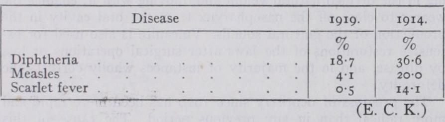 In this test 20,000 children of the first five school grades were under observation and treatment. The average number of car ious cavities was found to be over 7% per child; 30% claimed that they brushed their teeth occasionally; 6o% stated that they did not use a tooth-brush and io% had fistulous openings on the gums from abscesses at the roots of decayed teeth. Systematic application of oral hygiene, the intelligent and systematic use of the tooth-brush and the elimination of accretions, dental decay and suppurative conditions were followed by great improvement in general health and mental efficiency. Whatever may be the full explanation it is certain that deaths of Bridgeport children from diphtheria, measles and scarlet fever were fewer after oral hygiene had prevailed (i g i g) than they were before (I 9 I 4) . This is seen from the following table:— Under the direction of Supt. Willis A. Sutton, a dental clinic was installed in a school of 987 pupils in Atlanta and a hygienist, a dentist, a dietitian and a visiting teacher were selected. The number of days the children had been absent, in the past year, causes of the absences, the number of subject failures and the physical condition of each child as to weight and general appear ance were all carefully noted. Each child's mouth was then put in good condition and after three weeks new records were kept. All other factors entering into improvement were as carefully eliminated as possible. Upon comparison of the two records many significant deductions were made. First, the 987 children had less absences than the preceding year. Second, whereas the preceding year practically 20% had failed in one or more subjects, the year following the experiment less than 6% had failed. Third, every child in the entire group had gained in weight, ranging from 6 lbs. for the 9 months' period to 22 lbs., with an average of I I•2 pounds. Normally an average gain of about 8 lb. would have been expected. Fourth, the general appearance of the children had im proved remarkably, and they were far more spontaneous and happy than before. The dental clinics were then installed in other schools, with the result that of the 6o.000 children enrolled, 6,000 more per day attended school than formerly. The percentages of failures were reduced in the elementary schools by 8% and in the junior and senior high schools by 6%. The direct saving in money was $1 5o,000–$200,00o per year in a budget of $3,000,000.