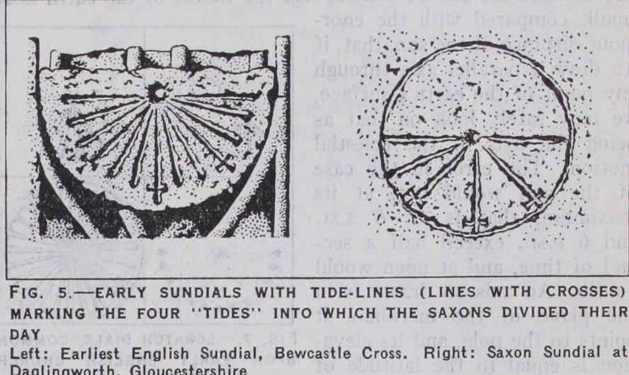 There are many early vertical south dials of great archaeolog ical interest on the walls of English churches. The simplest of all are the Anglo-Saxon dials, in which the day is divided into four tides of three hours each. A good example may be seen at Dagling worth. In the dial on Bewcastle Cross of the 7th century, hour lines have been intercalated between the early tide lines, which are marked with crosses. Upon church walls of the Early English period Scratch dials or Mass dials of various types are often found. In their simplest form they consist of a few hour lines radiating from a central hole in which a wooden style would have been inserted. A vertical noon line is always present. Lines at right angles to it would have been for 6 A.M. and 6 P.M., and one half way between the former and the noon line would have been for 9 A.M. Occasionally a circle of holes takes the place of the hour lines.