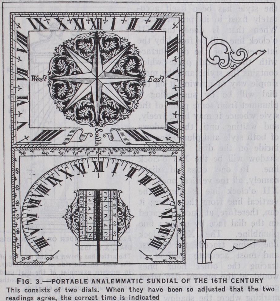 The Analemmatic Sundial dif fers from other portable sundials in that it can be set for finding the time without a compass. It in cludes two dials, an ordinary horizontal dial and an elliptical dial with a perpendicular gnomon which is set to the declination on a scale of months and days engraved along the minor axis of the ellipse. In use, the two styles cast two shadows on their respective hour scales. The instrument is then turned about until the two readings agree; when this happens the hour indicated is the cor rect time and the central line is true north and south.