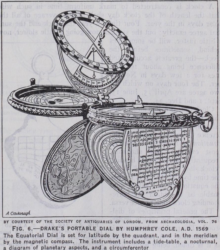 II. Compass Dials made their appearance in the 15th century, some 15o years after the description of the magnetic compass by Peter Peregrinus. In their simplest form they consist merely of a horizontal dial and a compass; but to these numerous acces sories were added in rapid succession, the most important being an adjustment for change of latitude, a plummet for levelling, subsid iary vertical and other dials for showing the various kinds of hours in use, a wind rose, volvelles for showing the phases of the moon or for use as adjustable calendars. These and other devices exer cised the ingenuity of the master craftsmen of Augsburg and Nuremberg, who vied with one another in the construction of a beautiful series of timepieces, which passed into all the coun tries of Europe. They were made of metal, wood, or ivory and the gnomons were either of metal or of a string that could be threaded through holes so as to vary the inclination with the latitude.
