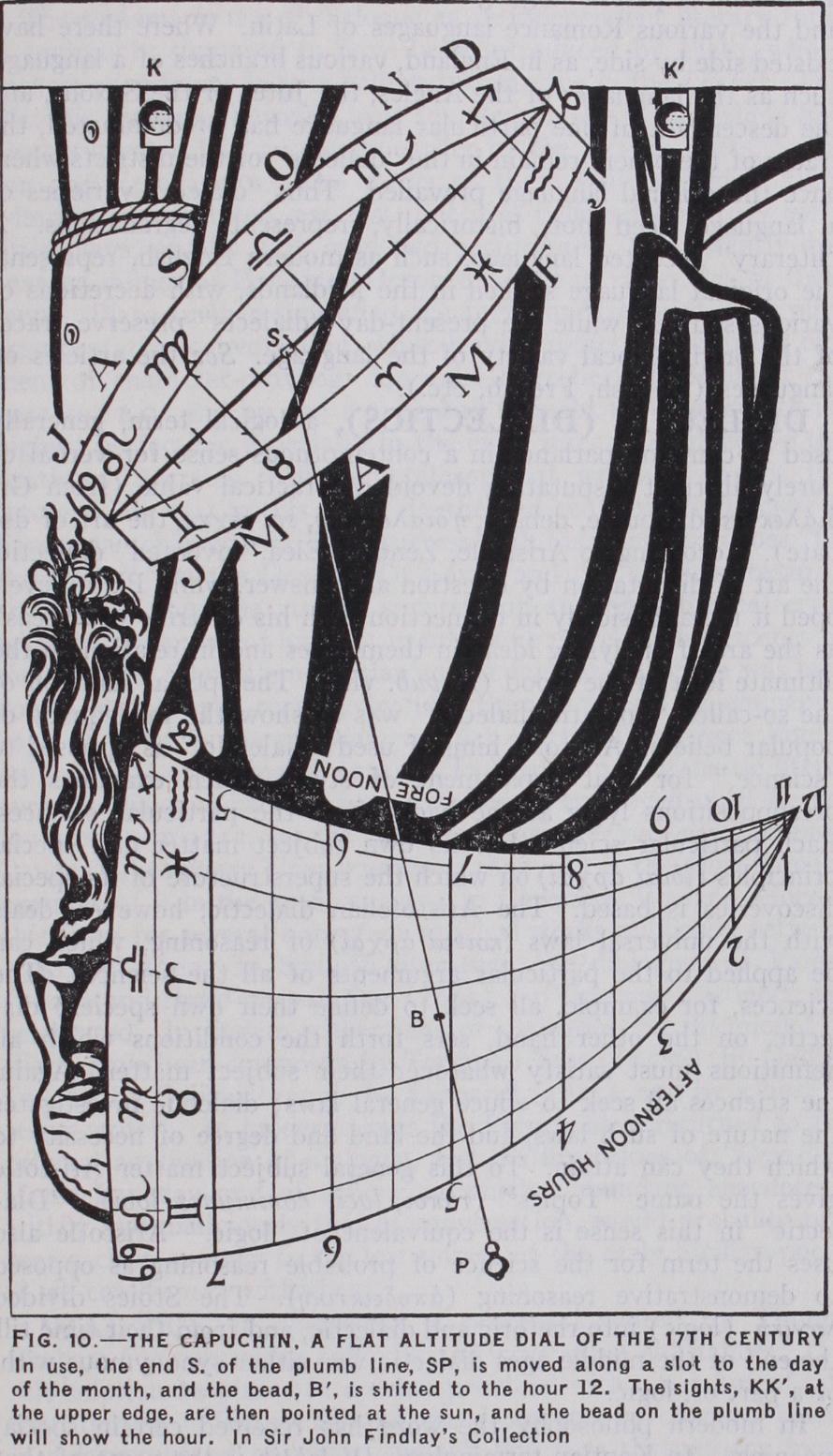 A very neat and ingenious flat altitude dial on a Card is attrib uated by Ozanam to a Jesuit Father, De Saint Rigaud, but it dates from the time of Regiomon tanus. It was sometimes called the capuchin, from some fancied re semblance to a cowl thrown back. Other altitude dials are the Quadrant dials, Ring dials, and Universal Ring dials. The Ring dial consists of a ring of brass that can be suspended by a small loop. A second, sliding ring within the first is drilled with a conical hole, with its apex to wards the inside. When the sun's rays pass through this hole they make a spot of light upon the op posite inner surface of the ring, which is divided by hour lines. The time can thus be read off.