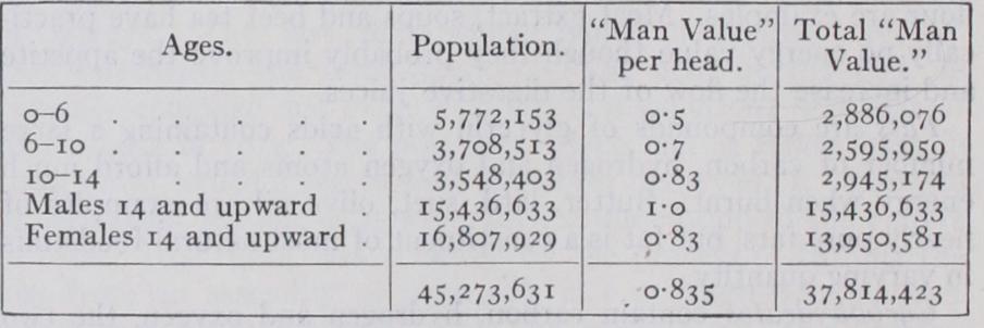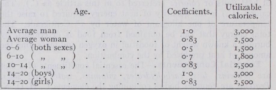 Age 5 6 7 8 9 Boys . . . IO26 I I00 1159 I 197 1262 Girls . . . Ioo8 1057 III0 1163 1201 Age Io II I2 13 14 Boys . . . 1328 1358 1389 Girls . . . 2266 1321 1539 The fact that growth is occurring implies that excess of energy must be taken over and above that required to furnish the energy output of the body. Between the ages of II and 16 both sexes put on weight at the average rate of about 4 kilos a year. This is equivalent to only 3o C. per day; but the growing body is formed at the expense of many different varieties of food which have to undergo chemical conversions of different kinds before they can take their place as part of the living body, so that prob ably the amount of energy which must be provided in the food to produce the necessary increase in weight is considerably in excess of 3o C. It is very difficult to compute the energy output due to muscular activity in children. Lusk gives the following table to show the food requirements of children in relation to that of an average man or woman : Average and Total "Man Value."—By using these coeffi cients we can determine the "average and total man value" of a mixed population.