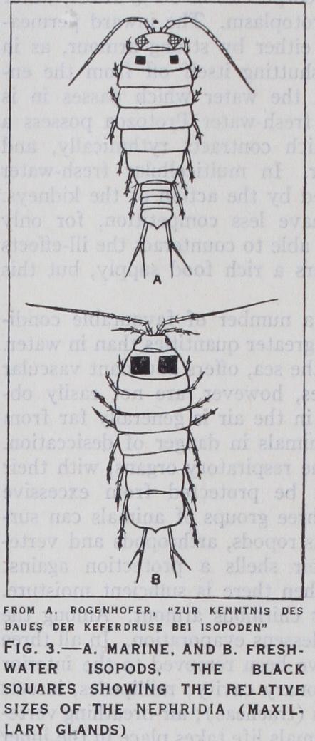 Fresh Water.—Fresh water, on the contrary, is dangerous to living organisms on account of the small amount of salts con tained in solution. As in the red corpuscles in o. 2 % NaC1, water is continually passing into the protoplasm. The inward permea tion of water may be prevented either by strong armour, as in water insects, the animal body shutting itself off from the en vironment; or, more frequently, the water which passes in is constantly discharged. Thus all fresh-water Protozoa possess a contractile vacuole (fig. 2), which contracts rythmically, and discharges water to the exterior. In multicellular fresh-water animals the same result is reached by the action of the kidneys. Fresh-water animals, however, have less competition, for only relatively few marine animals are able to counteract the ill-effects of fresh water. Fresh water offers a rich food supply, but this must be earned.