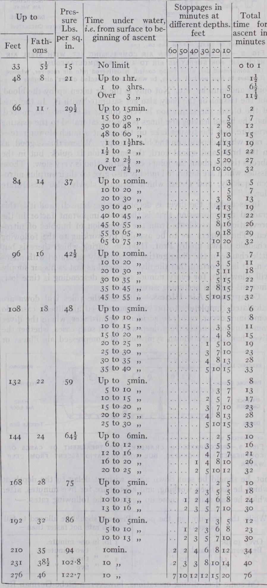 When gas is forced into a soda-water bottle under pressure, the water appears to be unchanged so long as the pressure is kept up, but the moment the pressure is reduced, by the removal of the cork, we see the gas come bubbling off the liquid. J. S. Haldane has applied the analogy to diving. He says : "The diver is the soda-water bottle, and his blood the fluid in the bottle. As the diver descends, nitrogen under pressure is forced into contact with his blood, which takes up the nitrogen from the air. So long as he stays below under that pressure, his blood appears to be unaltered; when however, he rises, the excess of nitrogen that the blood has taken up begins slowly to bubble off ; if the blood were as fluid as water, it would come off as rapidly as from the soda water. For tunately for the diver, the blood is a thickish, albuminous fluid, in which bubbles do not readily form, and, as far as we can see, it can retain about twice the amount in solution that water can keep at any given pressure. Every diver knows that it is quite safe to come up from a depth of five or six fathoms to the surface as quickly as he likes ; the reason for this will now be easily under stood, since at such a depth the blood has only twice as much nitrogen in it as it has on the surface, and, therefore, bubbles are unlikely to form. If, however, the diver has been for any consid erable time at, say, 18o f t., and then comes up too quickly, it is almost certain that bubbles will form and cause serious symptoms, such as paralysis of the legs (diver's palsy), severe pains in the joints and muscles, etc. Not only is the air taken up by the blood, but the tissues of the body also get saturated with it. In the case of the blood, the saturation is very quick; it is probable, indeed, that the blood leaving the lungs is always saturated to the existing pressure, but the tissues take up the gas at a much slower rate— a rate which depends on the blood supply. Where this is good, as in the brain and spinal cord, the saturation is quick, but in the fibrous tissues about the joints, etc., saturation is very slow. Those tissues which are saturated quickly also give up their surplus nitro gen quickly, and those which saturate slowly also desaturate slowly." In ascending, the diver is decompressing himself, and it is this gradual decompression that is the most important factor in the prevention of accidents from the formation of bubbles of nitro gen. The dangers are to be avoided by working to the following schedule drawn up by Prof. Haldane, during which there is but little chance of the diver getting dangerously saturated with nitro gen. It is important that the diver descend as fast as his air supply will allow him, for every minute spent in descending is time lost, since his body is becoming saturated.