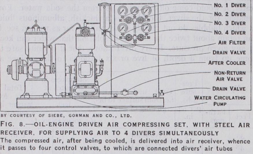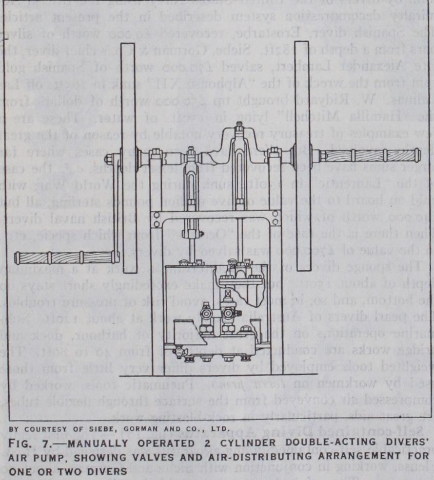 Air Pumps.—Diver's air pumps are of various patterns, depend ing principally upon the depth of water in which work is being carried out, since the greater the depth of water the greater the quantity of air required by the diver. The pumps are of the recip rocating type and are mostly manually operated. Fig. 7 shows the Siebe-Gorman two-cylinder double-acting pump (removed from its teak chest) adopted by the British Admiralty. Pressure gauges are provided which indicate the pressure of air which the pump is supplying, and the depth at which the diver is working. The cylinders are water-jacketted to ensure a supply of cool air to the diver.
