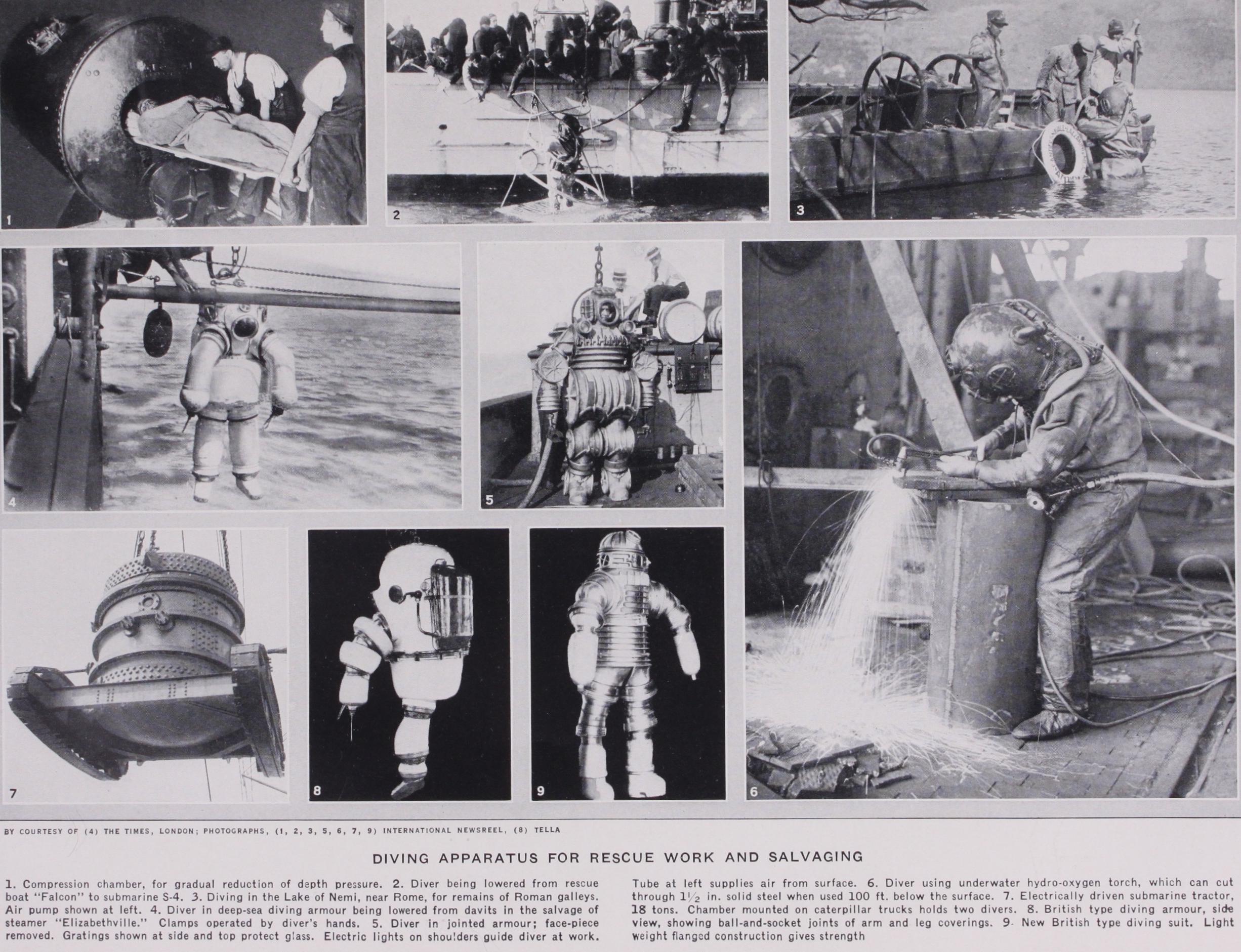 Recently, Neufeldt and Kuhnke have constructed a diving dress of steel and aluminium alloy, which, they claim, enables the wearer to do the work of a diver in the ordinary (flexible) dress. This diving suit is independent of outside air supply, and is de signed to withstand the pressure due to the head of water at which the diver is working. The diver, therefore, breathes air at normal atmospheric pressure, thereby eliminating the effects due to excessive air pressure. Connection with the ship can be main tained by a cable and communication effected by a telephone. A diver equipped with the dress has recently (Aug. 1928) worked on the wreck of the Belgian steamer "Elizabethville," sunk in 1917 off Belle Isle, at a depth of 240 feet.