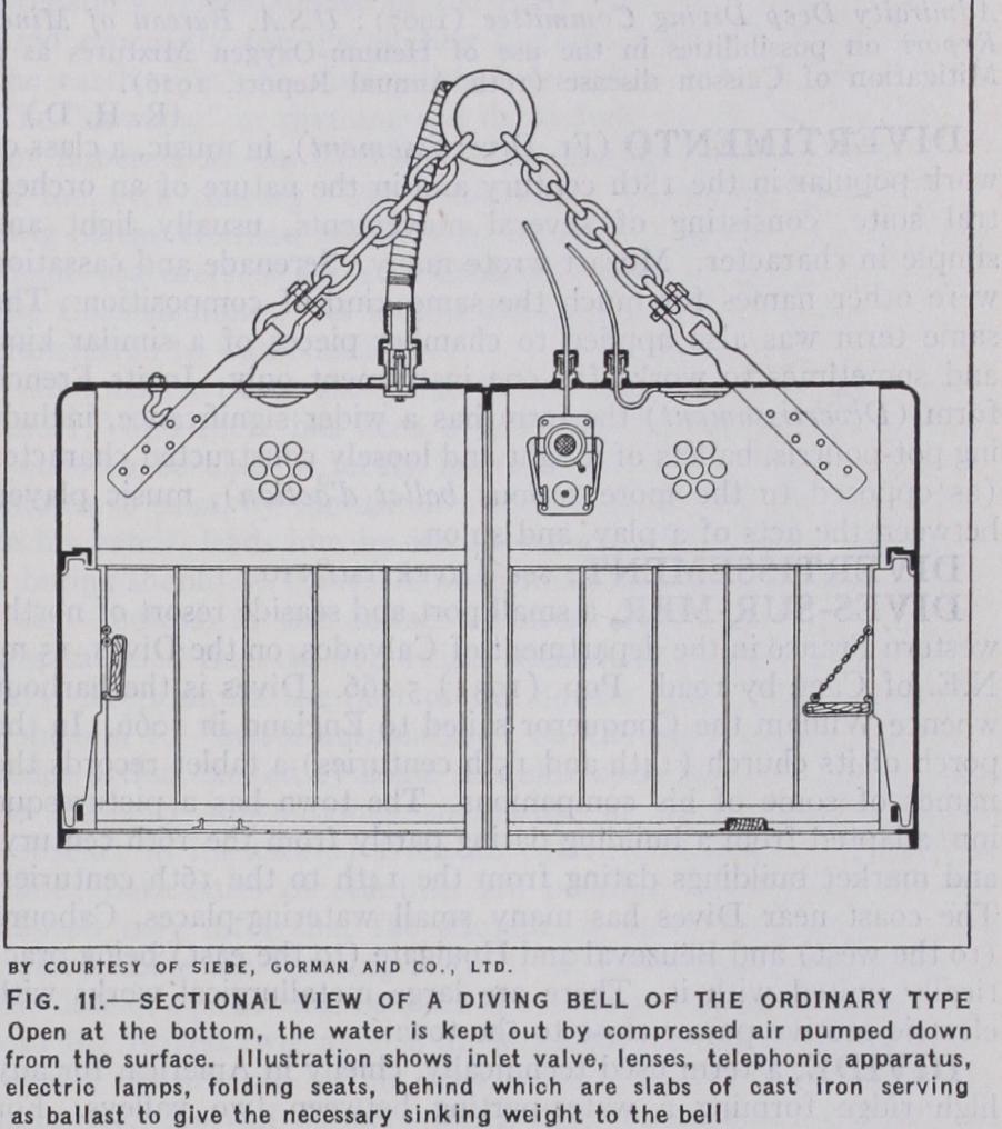 Fig. 11 illustrates one of several Siebe-Gorman ordinary diving bells, built of steel, as used during the construction of the Na tional Harbour at Dover. Each measured 17ft. long by Io%ft. wide by 7ft. high, and weighed 35 tons. It was lighted electrically, and fitted with telephonic apparatus which enabled the bell divers to converse with the engineers and crane and compressor attend ants at the surface. Air was supplied to the bell by a steam driven compressor housed on the gantry which carried the travel ling cranes for lowering and raising the bell through the water to a maximum depth of 6of t., and also for lowering the concrete blocks. The air tube for the compressor was connected to a non-return air inlet valve fitted in the crown of the bell. As in the case of the diving dress, an adequate supply of air at the right pressure is maintained to ensure proper ventilation of the bell, the excess escaping at the lower edge of the latter. The bell divers were employed in levelling the sea-bed in readiness to receive the blocks, which weighed 4o tons apiece. Having levelled one sec tion, the bell was moved to the next. The blocks were then powered, and were placed in position by helmet divers. The bell divers, clad in woollen suits and watertight thigh boots, worked in two-hour to three-hour shifts. The cost of such a bell, with air compressor, telephone and electric lamps, is about £ 2,000.
