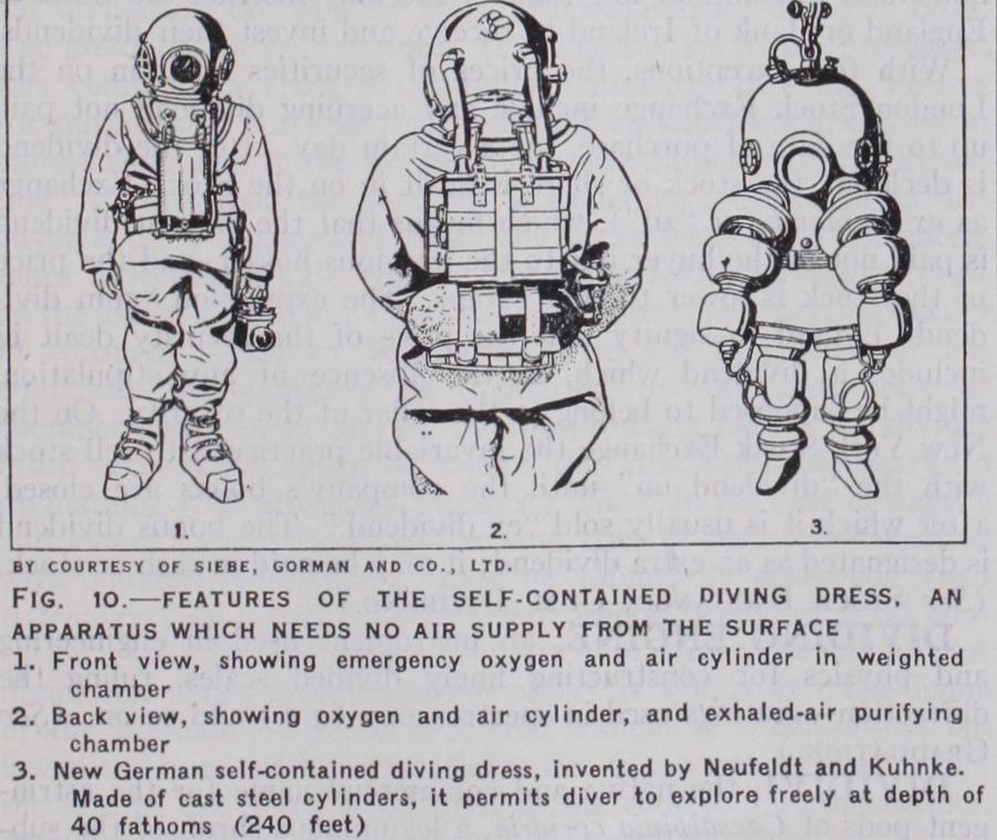 Self-contained Diving Apparatus (fig. io).—The first really practicable self-contained diving apparatus was designed by H. A. Fleuss, working in conjunction with Siebe and Gorman, about 50 years ago. The original apparatus enabled a diver to do good work in the flooded Severn tunnel in 1882. The diver on that occasion had to travel nearly a quarter of a mile through the workings—encountering all sorts of obstacles, floating timber, etc., on his journey—to a heading in which he had to close an iron door and a sluice valve. Later, Fleuss and R. H. Davis improved the apparatus considerably. The apparatus supplies a factitious, but perfectly respirable air by means of regenerating devices, thus making him independent of the surface. His dress, helmet and boots are of the ordinary patterns. Attached to a leather equipment carried on his back is (1) a cylinder of oxygen and air in certain proportions (it is dangerous to breathe pure oxy gen at pressures above one atmosphere plus, hence the dilution) ; (2) a reducing valve connected to the cylinder, and passing the gas into the helmet through a tube connection at the requisite pressure and volume; (3) a watertight chamber, containing caustic soda, also connected by tube to the helmet. The diver's exhaled air is passed through the caustic soda, which takes up the carbonic acid, and, thus purified, comes back into the helmet where it mixes with the fresh oxygen and air which is constantly passing from the cylinder. This process of regeneration goes on auto matically for from 45 minutes to two hours, according to the depth at which the diver may be working. The apparatus can be used at depths down to I 5of t.