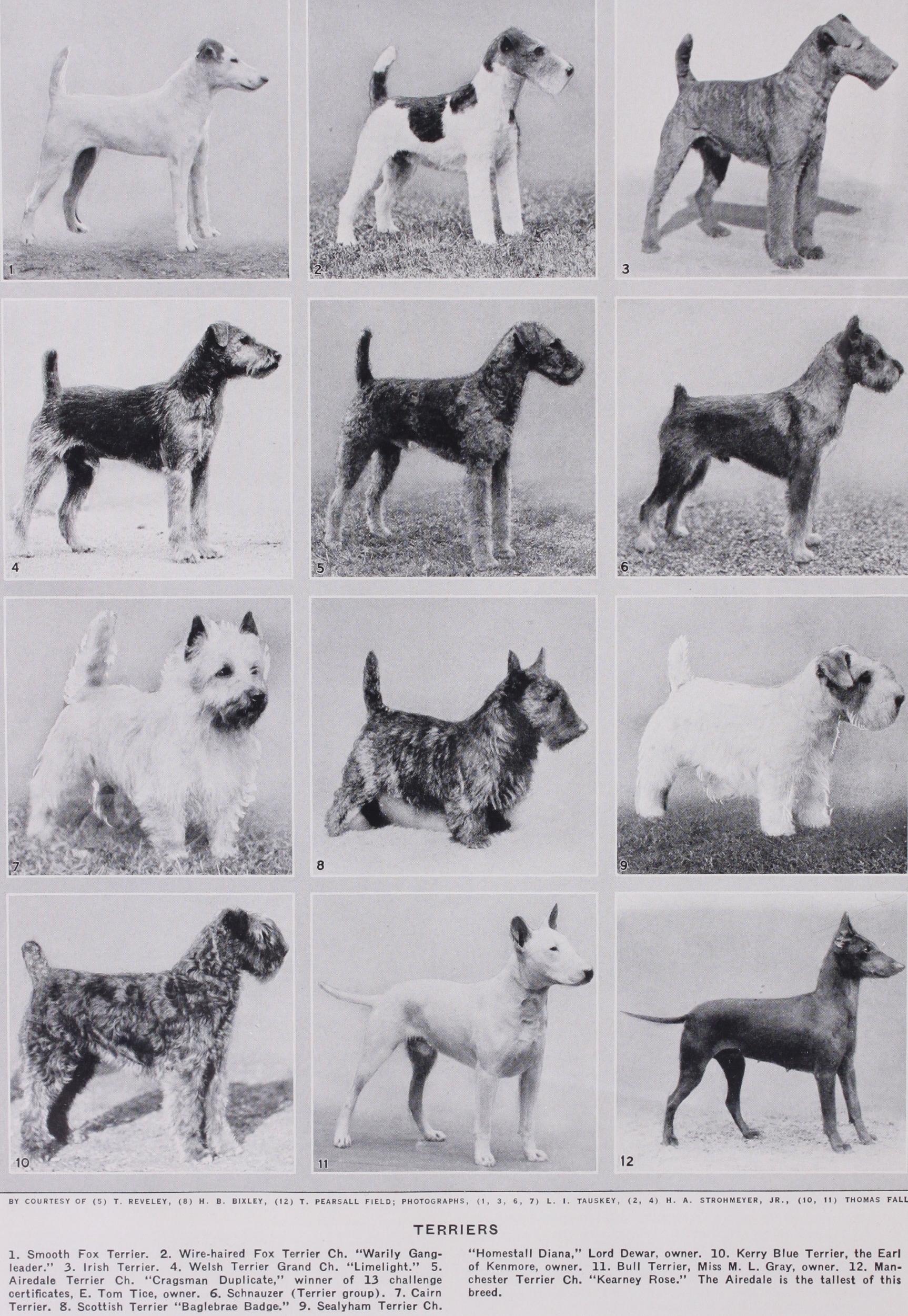 The Terrier Group has a number of breeds differing so profoundly from each other that the extreme types have hardly a character in common. It is linked with the mastiff group through the bull-terrier which was originally produced by crossing the bulldog with the white English terrier. Other strains, like grey hound, pointer and Dalmatian, were also, it is said, added to give size and eliminate the defective bulldog physiognomy. The result at all events has been a hardy dog of exceptional courage and strength. The Boston Terrier had a similar origin, but the head in this breed has retained many of the bulldog character istics. With the hound group the terriers are connected through the Airedale, which resulted from a cross between the otter hound and a local terrier of the Aire valley. This is the largest of the terriers, but apart from size the original breed did not differ greatly from rough-coated Welsh or Irish terriers. Another rough-coated terrier of tolerably large size is the Bedlington breed with a flattish head and long ears, originally owned by the gypsies and tinkers of Northumberland who used it for otter hunting and killing vermin.
