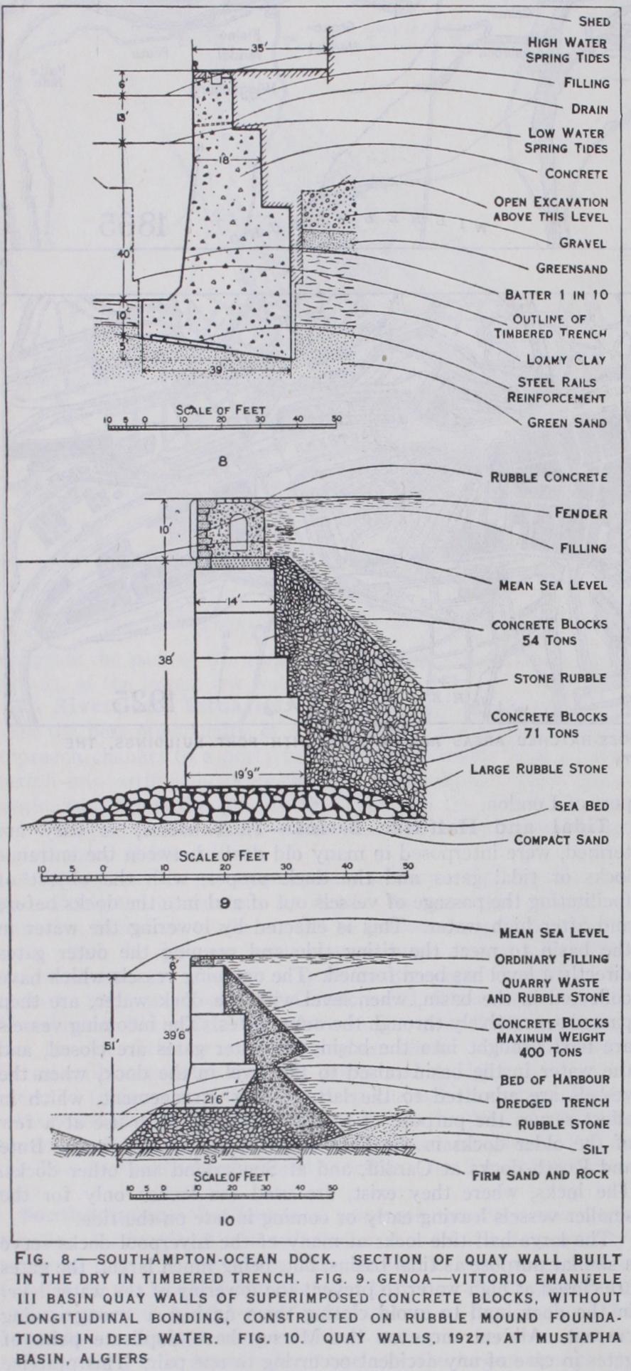 The Tilbury docks (1886) (Plate II., fig. 1), consist of a series of branch docks separated by wide, solid quays, and opening straight into a vestibule dock in which vessels can turn on enter ing or leaving. An extension of the main dock at its western end to form a larger branch dock was made in 191 2-1 7, adding about 17 acres to the previously existing 54,1 acres of dock water area. (See Proc. Inst. C.E., 1923.) A further enlargement was begun in 1926 which will provide an additional entrance higher up the river, and a water area sufficient for turning the largest ships.