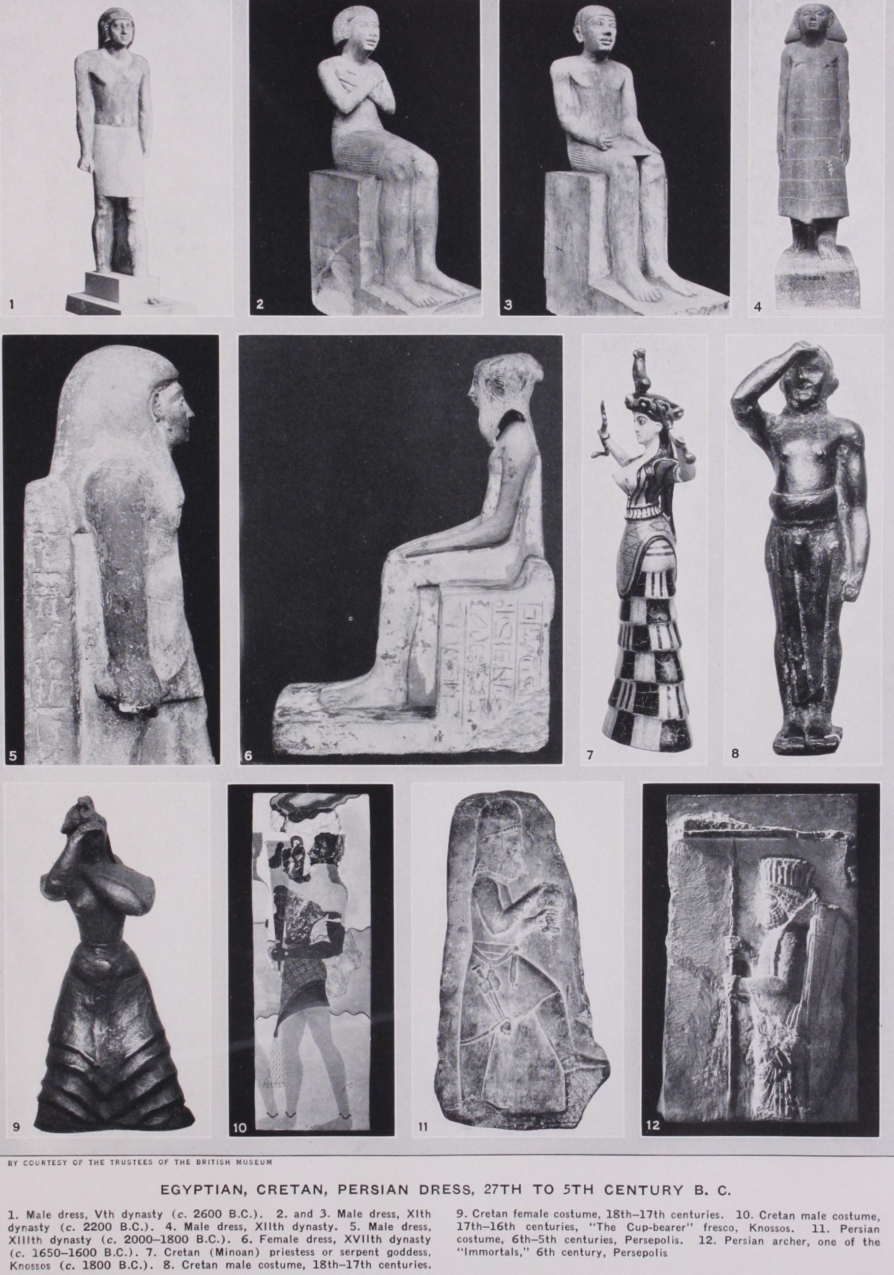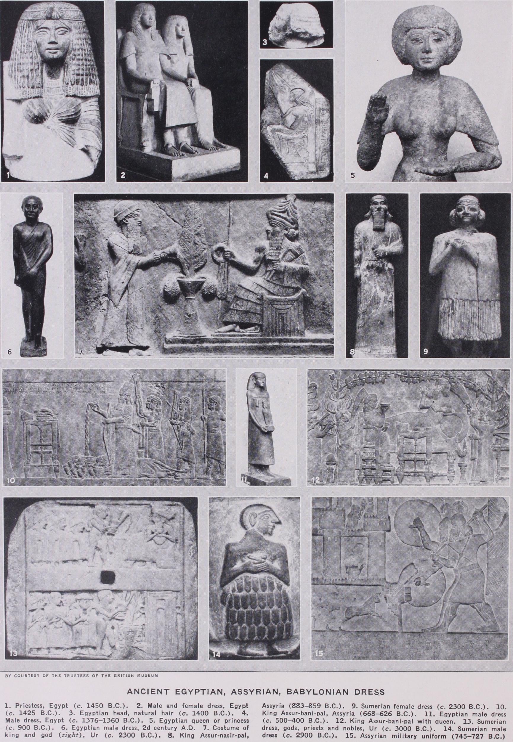 We have so few representations of Babylonian or Assyrian women, other than goddesses (who wear long flounced robes) that it is almost impossible to say much of their costume. In the early period one sees them wearing a modification of the men's kaunakes, with hair rather more elaborately dressed than the men's (see above) and ornamented with nodding balls or flowers of gold and lapos on a comb-like ornament that was stuck into the catogan with a sharp-ended shank. Later on they wore a shape less robe, with the hair usually "down." Assyrian women wore earrings of great length and weight like the men's, and other adornments like theirs. The Ur excavations have shown that the Sumerian women of 2,000 years before already used "vanity-cases" of gold, with tweezers, earpick and head-scratcher complete.