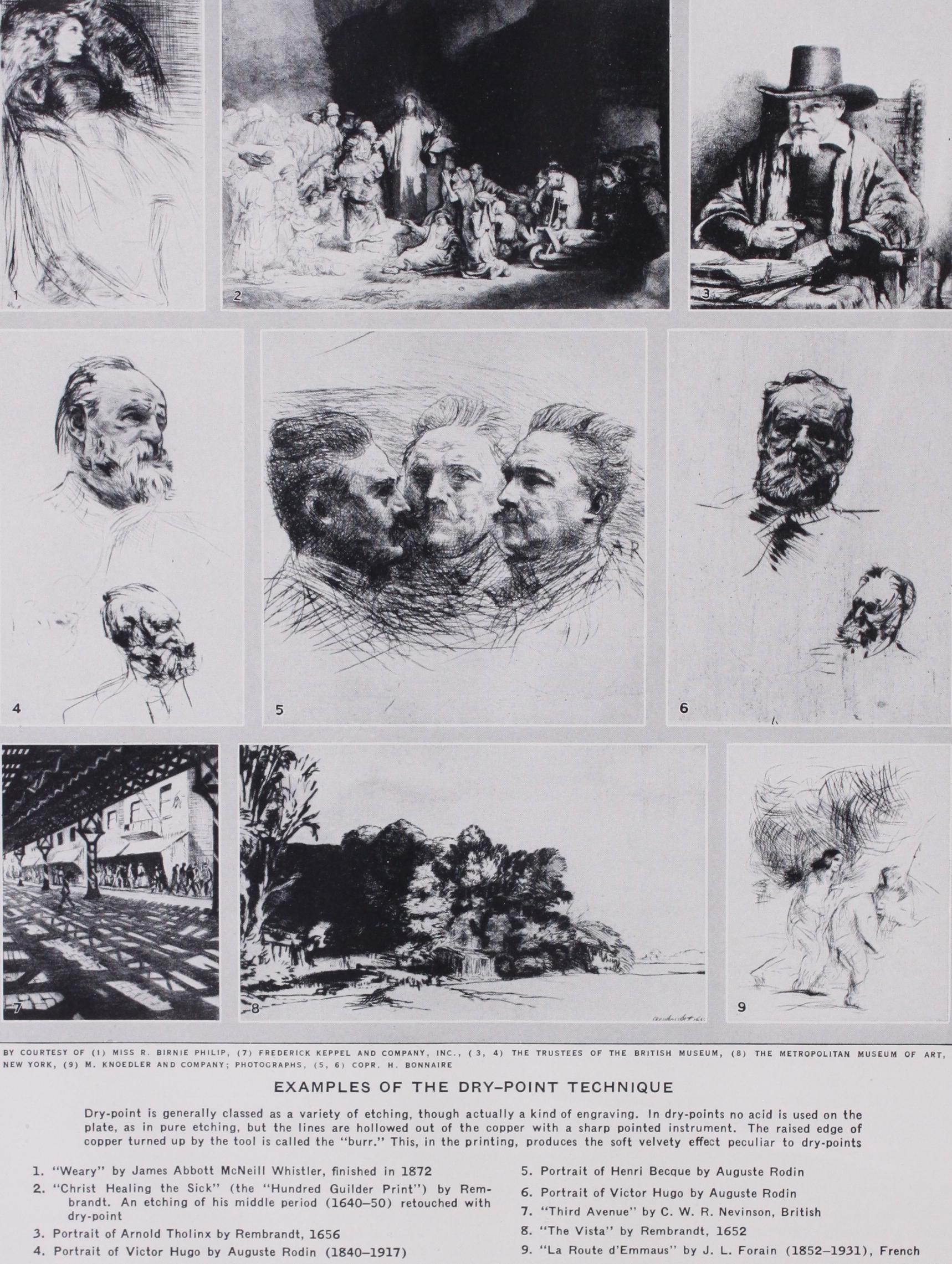 Dry-point has sometimes been used by line-engravers, instead of etching to which they far more frequently resort, in the first preparatory stage (outline) of plates which are subsequently to be finished with the burin. Much more usual is the combination of dry-point with etching. Such a combination may be made either for the purpose of the general enrichment of an etched plate, in a second or subsequent state, by the addition of the dry-point burr, or for the sake of introduc ing small corrections, which can be made far more easily, though less permanently, by the addition of a few touches or lines with the dry-point than by an additional biting of the etched plate, which involves stopping out or the laying of a fresh ground. Dry point additions to an etched plate can be readily distinguished by a trained eye in early impressions, but they wear away gradually till all trace of them is lost, and it is the presence of a clearly visible dry-point work, with all the richness that it was intended to impart, that confers value on early impressions of such an etching as the "Hundred Guilder Print" of Rembrandt, in its second state, or on the single state of "Christ Healing the Sick" by the same artist, though both the rich early impressions and the bare late ones from the worn plate which has lost its burr have to be described as belonging to the same state.