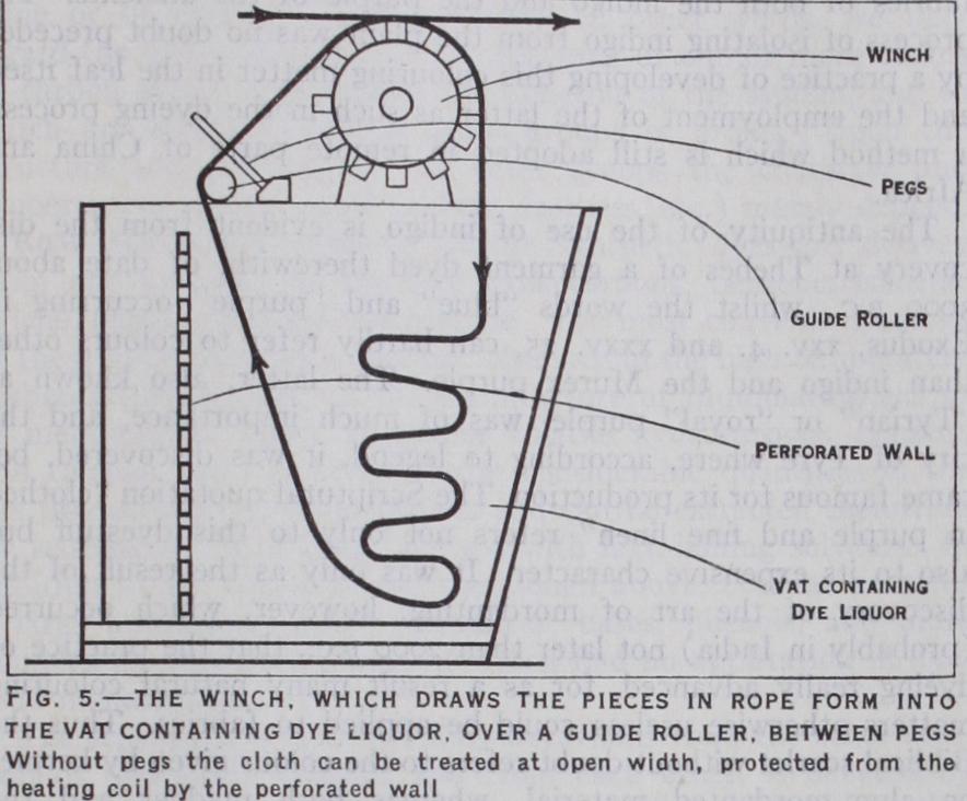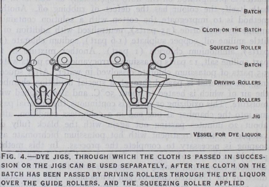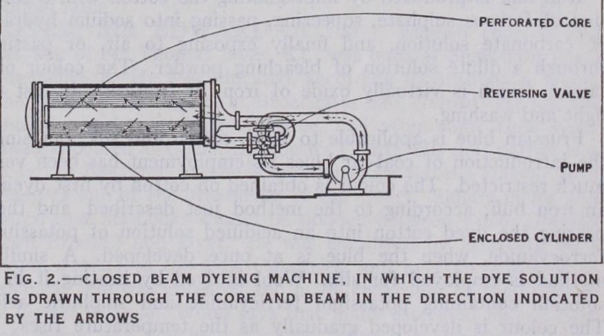 In the so-called "compact" system of cop dyeing the cops are packed as closely as possible in a box, the top and bottom (or the two opposite sides) of which are perforated, the interstices be tween the cops being filled up with loose cotton, ground cork or sand. The dye liquor is then drawn by suction or forced by pres sure through the box, thus permeating and dyeing the cops. Dyeing of Pieces.—Plain shades are usually dyed in the piece, this being the most economical and at the same time the most expeditious means of obtaining the desired effect. In the dye-jigger (fig. 4) the goods are passed backwards and forwards over guide rollers between two batching rollers. The arrangement admits of treating a large quantity of material with comparatively little dye liquor. Another machine is that shown in fig. 5. This is suitable for heavy fabrics. The pieces are stitched end to end in a band which passes over a winch. Washing off may be done on the same machine.