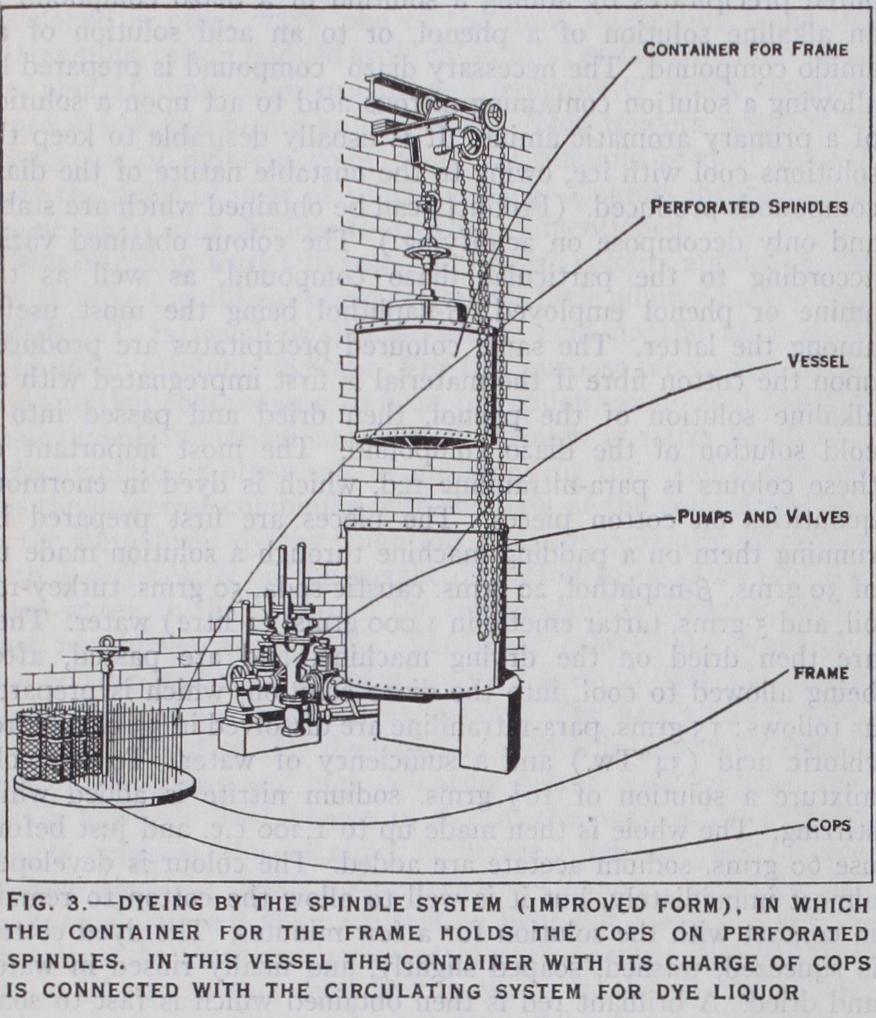 Large quantities of yarn, especially cotton, are dyed in the cop, for weft. The main advantage of this method is at once apparent, inasmuch as the labour, time and waste of material incurred by reeling into hanks and then winding back into compact form, so as to fit into the shuttle are avoided. A thin tapering perforated metallic tube is inserted in the hollow of each cop. The cops are then attached to a perforated disc (which constitutes the lid of a chamber or box) by inserting the protruding ends of the tubes into the perforations. The chamber is now immersed in the dye-bath and the hot liquor is drawn through the cops by means of a cen trifugal pump and returned continuously to the dye-bath. This principle is known as the skewer or spindle system.