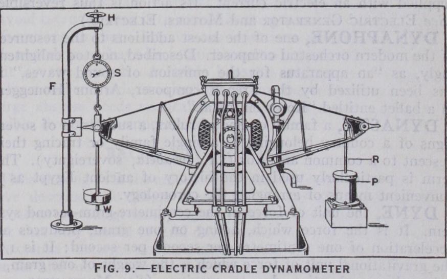 DYNAMOMETER, an instrument for measuring force ex erted by men, animals and machines. (Gr. bvvapts, strength, and l2 Tpov, a measure). The name has been applied generally to all kinds of instruments used in the measurement of a force, as for example electric dynamometers, but the term specially denotes apparatus used in connection with the measurement of work, or in the measurement of the horse-power of engines and motors. If P represent the average value of the component of a force in the direction of the displacement, s, of its point of application, the product Ps measures the work done during the displacement. When the force acts on a body free to turn about a fixed axis only, it is convenient to express the work done by the trans formed product TO, where T is the average turning moment or torque acting to produce the displacement 0 radians. The ap paratus used to measure P or T is the dynamometer. The factors s or 6 are observed independently. Apparatus is added to some dynamometers by means of which a curve showing the variations of P on a distance base is drawn automatically, the area of the diagram representing the work done ; with others, integrating apparatus is combined, from which the work done during a given interval may be read off directly. It is convenient to distinguish between absorption and transmission dynamometers. In the first kind the work done is converted into heat ; in the second it is transmitted, of ter measurement, for use.