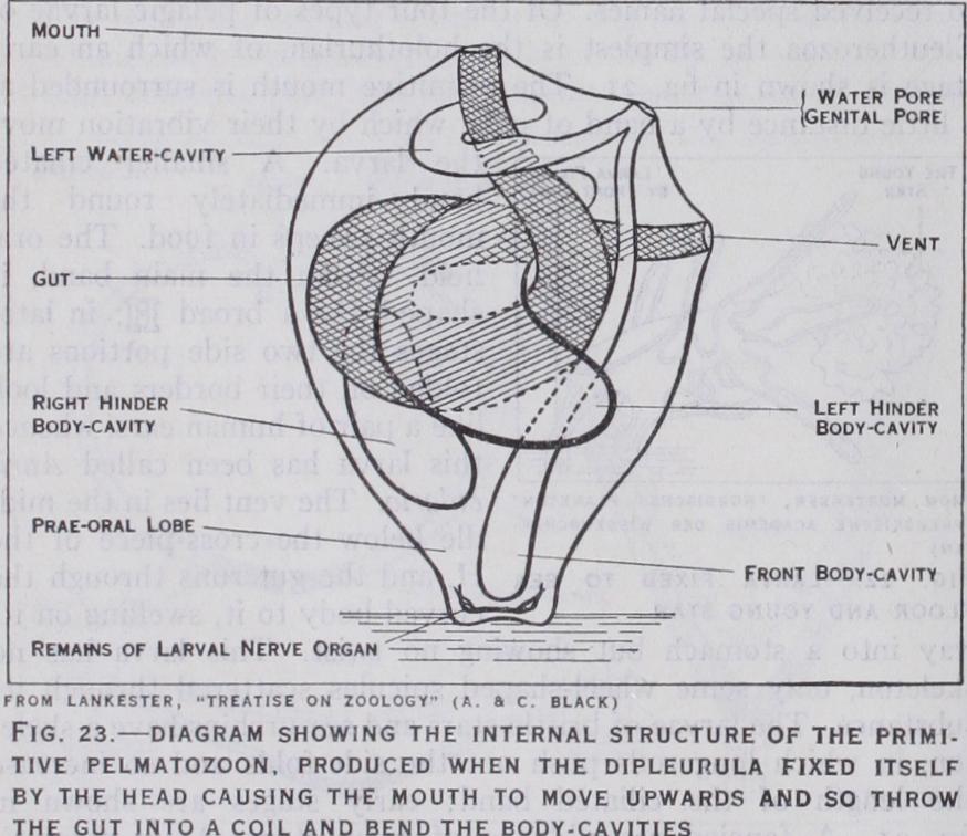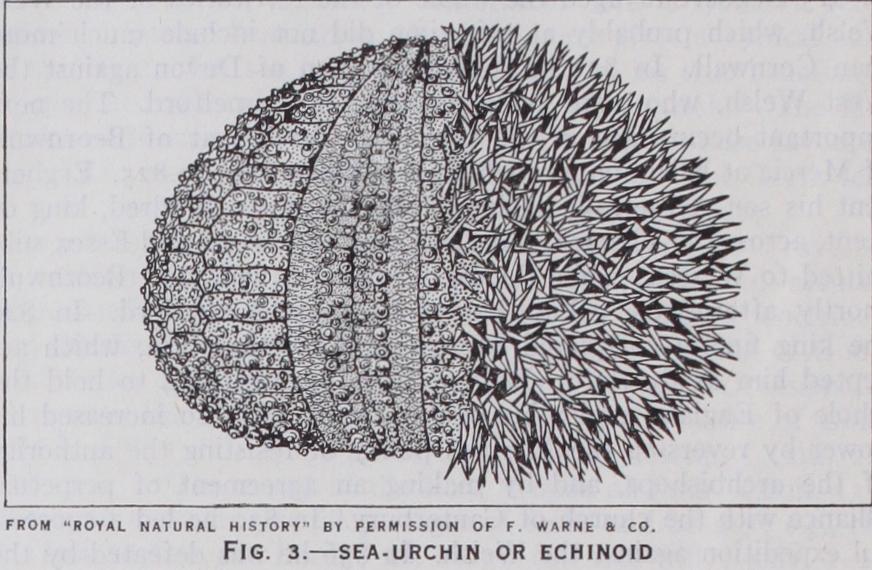 Geology gives only a succession of fossil forms ; the relation of these to one another is interpreted through facts of anatomy and development, and seen to be an evolution. In its main lines the race-history is now thought to have been as follows. We start with a dipleurula larva (fig. 9) , still free-floating and with none of the peculiarities of the modern adult echinoderm. The event that originated the branch was the discovery of the sea-floor, on which followed the adoption of a stationary life and the deposi tion of lime spicules in the skin. The three-rayed spicules grew into star-shaped plates loosely joined, such as are scattered in Lower and Middle Cambrian rocks. As the plates grew, they were more firmly united, and completer skeletons were preserved. These, at the outset, show a divergence. The Machaeridia (fig. Io) may represent the elongate stage before fixation. If the elongate form became fixed by the middle of its body, the mouth and the vent would be on the two sides of the base of attachment, and from such a creature all the nonradiate Carpoidea (fig. I I) may have descended. They are found only from Middle Cambrian to Devonian.