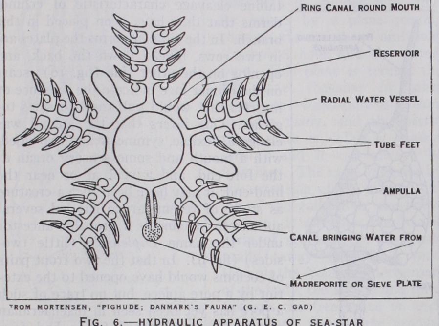 In the Asteroidea (fig. r) the ambulacral grooves remain open and the podia change into tube-feet, each with a sucker at the end, by which the sea-star clings to objects and pulls itself along; a podium can be withdrawn into the groove by its muscles, when its fluid contents pass into the ampulla; contraction of the am pulla squeezes the fluid again into the podium, swelling it out for use. The arms are not, as a rule, sharply distinguished from the body, and they contain both genital glands and blind extensions of the digestive system (caeca). The body-fluids are aerated through thin-walled outgrowths of the body-cavity (papulae) which pass between the plates of the upper surface. Podia and papulae are protected by thorns or spikes, which are sometimes clumped (paxillae), sometimes branched and bearing a mem brane, sometimes modified into small grasping organs (pedi cellariae). Many sea-stars have more than five arms, but the arms never fork.