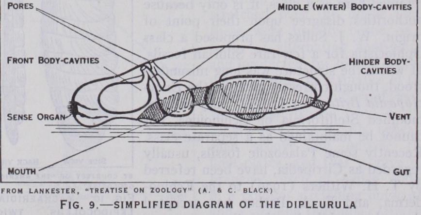 The five classes into which, as said at the outset, Echino derma now living are usually divided, are not of equal value, for the Asteroidea and Ophiuroidea diverged in a comparatively late geological period, so that the differences between them are not so profound as those that distinguish the other classes; the difficulty is met by merging them in a super-class, Stelliformia. In early Palaeozoic times there existed other classes, all of which became extinct before the Mesozoic era began. Most of those creatures resembled the crinoids in being attached to the sea-floor and in feeding on minute organisms, which they swept along ciliated grooves into their usually upturned mouths. They have therefore been grouped with the crinoids as Pelmatozoa (stalk-animals), while the remaining classes, which are free-moving and generally feed with down-turned mouth on larger organisms, have been op posed to them under the name Eleutherozoa (free animals). These names conveniently connote definite facts of structure and habit, but do not imply any closer relationship between the classes included under them. The classification here adopted embodies a few recent advances. Certain Pelmatozoa that, in editions of the Encyclopedia Brit annica after 1900, have been placed under Cystoidea as an order Carpoidea are now distinguished as a class. On the other hand the Blastoidea, though numerous and rather sharply defined, are a relatively late off shoot from the Cystoidea, and if they are retained here as a class, it is only because authorities disagree upon their point of origin. W. J. Sollas has proposed a class Ophiocistia for a few rare Silurian fossils, of which the structure was long misunder stood, though correctly given in the Ency clopedia Britannica (1911) ; they may be modified Stelliformia or Echinoidea, but cannot be maintained as a separate class. Recently some Palaeozoic fossils, usually regarded as Cirripedia, have been referred by T. H. Withers (1926) to the Echino derma, and F. A. Bather has accepted that view, while keeping them apart as a rub-branch, Machaeridia. The larger divisions of the Echinoderma here accepted may be tabulated, without implication as to their mutual affinities, thus : With no trace of Radial structure t Machaeridia tCarpoidea With more or less Radial structure f Cystoidea Pelmatozoa f Blastoidea Crinoidea f Edrioasteroidea Machaeridia.—Of the Machaeridia only the skeleton is known, and it is mainly because its plates have shown the crys talline cleavage characteristic of echino derms that they have been placed in this branch. In the simpler forms the plates are in two rows, hinged down the back, and opening on the other side (fig. Io) ; scars on their inner face indicate the presence of muscles that would pull the two sides to gether. One infers that the animal was elongate, flexible, symmetrically two-sided, with a mouth and some sensory organ at the fore-end, and a vent at or near the hind-end ; it may have been such a creature as study of recent larvae has led several authors to imagine as a probable ancestor under the name Dipleurula (little two sides) (fig. 9). In that the two front pairs of coeloms would have opened to the exte rior by a pore apiece, but no trace of such a pore has yet been seen in machaeridian plates. More advanced forms had four rows of plates, two on each side. At one end a plate was often modified in a way that suggests temporary fixation.