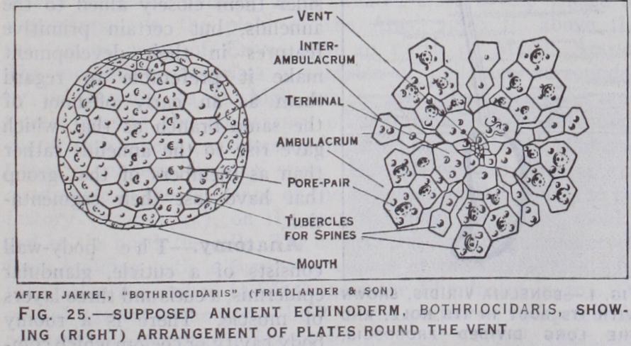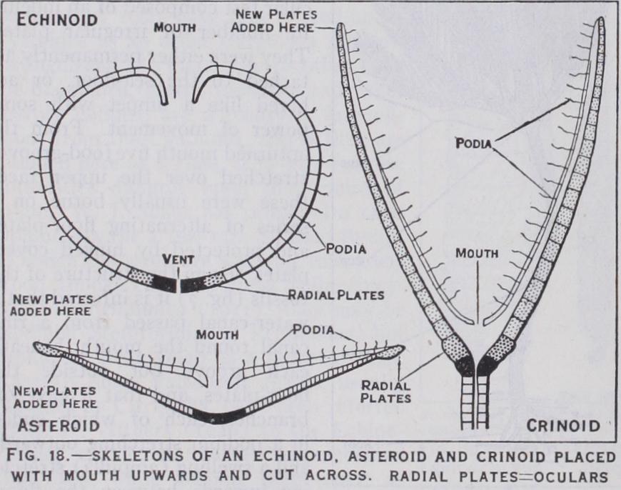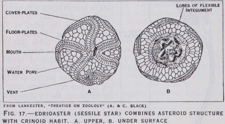 Edrioasteroidea.—The Edri oasteroidea (fig. 17) had a cir cular test composed of an indefin ite number of irregular plates. They were either permanently at tached to the sea-floor, or ad hered like a limpet with some power of movement. From the upturned mouth five food-grooves stretched over the upper face ; these were usually borne on a series of alternating floor-plates and protected by hinged cover plates. From the structure of the fossils (fig. 7) it is inferred that a water-canal passed from a ring canal round the mouth, beneath each groove but outside the floor-plates, and that it gave off branches, each of which ended in a podium stretching outwards and a swelling (ampulla) stretch ing inwards between the floor plates to form a reservoir ; no other Pelmatozoa show such a structure. There were no brach ioles. The gut seems to have had a solar coil; its vent and madre porite lay on the same side as the mouth. In some genera the depth of the food-grooves impressed a five-rayed symmetry on the generative organs.