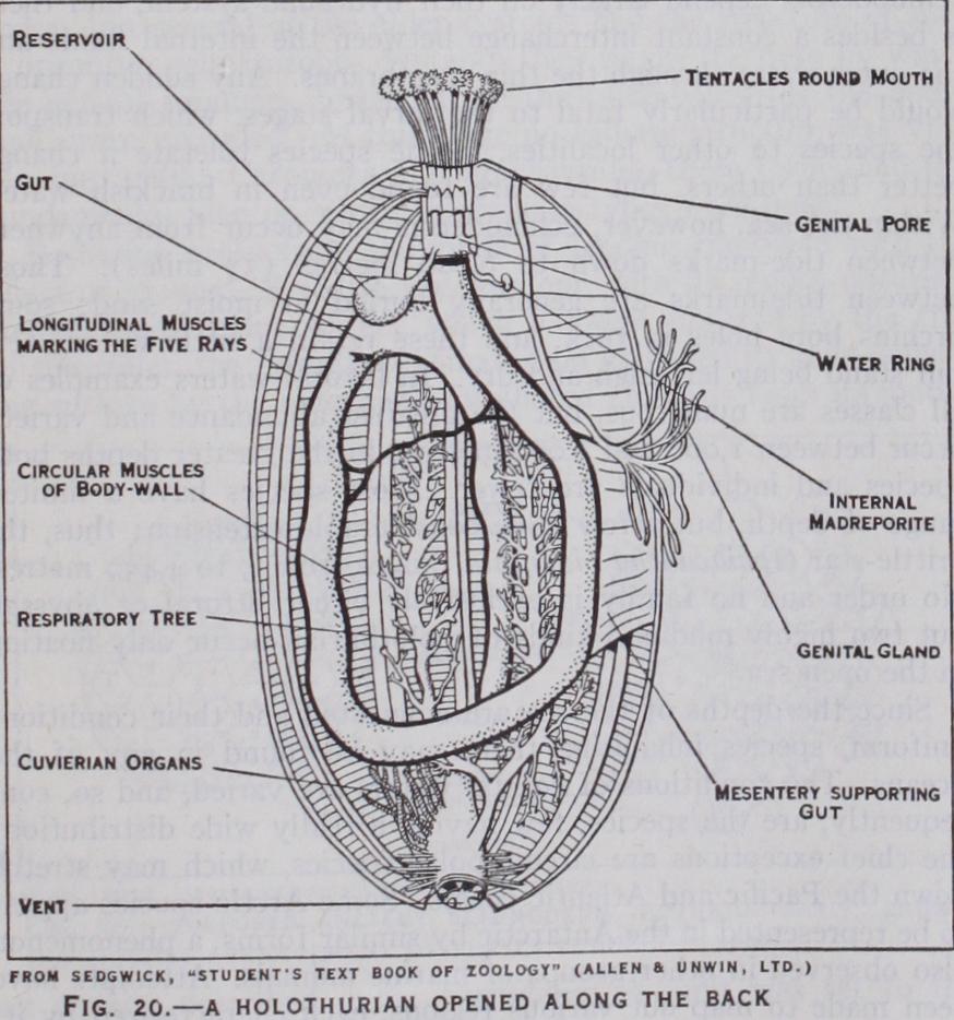 The following special features are found in most holothurians (fig. 2o). The mouth is surrounded by the ten front which have become prominent tentacles. Outside these is a rim, which can close over both mouth and tentacles. The body-wall has two sets of muscles : a transverse, circular layer, which, on contraction, compresses the contained fluids and thus elongates the body; five pairs of longitudinal muscles, alongside the radii, which on con traction shorten the body (it is hard to hold a holothurian). The gut passes from the mouth, below interradius C/D to the hinder end of the body, then forwards along interradius D/E, then downwards along A/B to the vent ; thus it has a solar coil as in crinoids and echinoids. Most holothurians suck in water through the vent for aeration ; to accommodate this the rectum is enlarged and, in numerous species, gives off two many-branched tubes with blind ends, termed the respiratory trees. In most holothurians the skeleton is greatly reduced. Round the gullet is usually a ring of five radial and five interradial pieces, which may correspond to the mouth-frame of echinoids. There are no regular plates in the body-wall, but throughout the skin and the connective tissue are scattered minute spicules, which have different shapes character istic of the various genera and species; in one or two genera some of these are enlarged to form irregular plates, and in one or two they are absent altogether.