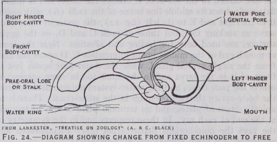 Between the larva and the adult is a series of complicated changes, during which the larval skeleton is absorbed and rede posited as the permanent skeleton, while portions of the creature are often cast aside as worn out trappings. Such a marked change is called a metamorphosis (q.v.). It is best known in some of the sea-stars, where it takes about 12 days. The larva sinks and attaches itself to the sea-floor by a portion of the prae-oral lobe (fig. 22); this is pulled out into a stalk, and the future star developed within the body of the larva. The essential change is the curving of the left hydrocoel and the left hinder coelom round the gut, till each becomes a ring. In the asteroid the oral face of the star bends downwards towards the stalk and the floor, and the water-ring closes round the stalk, which then disappears (fig. 24). In the crinoid the oral face is bent upwards, so that the water ring does not enclose the stalk (fig. 23) . As shown in fig. i 2 the water-ring closes in a different interradius with reference to the M plane in each class; this is connected with the torsions that occur during metamorphosis.