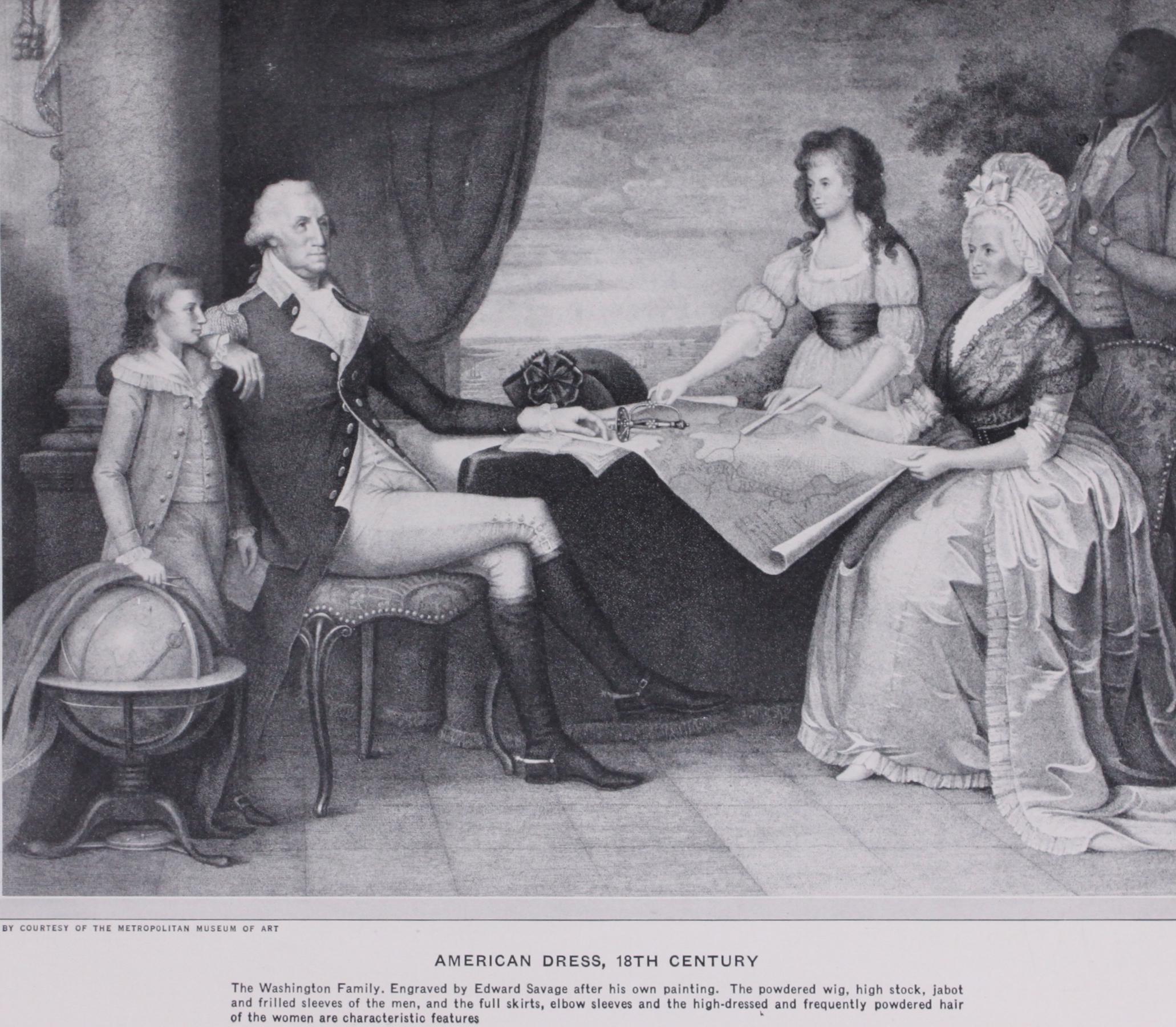 Women's dress at the opening of the century is marked by a graceful simplicity, with high waist and low neck. A lower waist and puffed sleeves follow. Meanwhile skirts were widening, until the "crinolines" took their most exaggerated form shortly after the middle of the century. Then followed various adapta tions of 18th century styles. About 188o the projecting "bustle" at the back was in full popularity. Fringes, trimmings, flounces and long trains were in use during the latter part of the century.