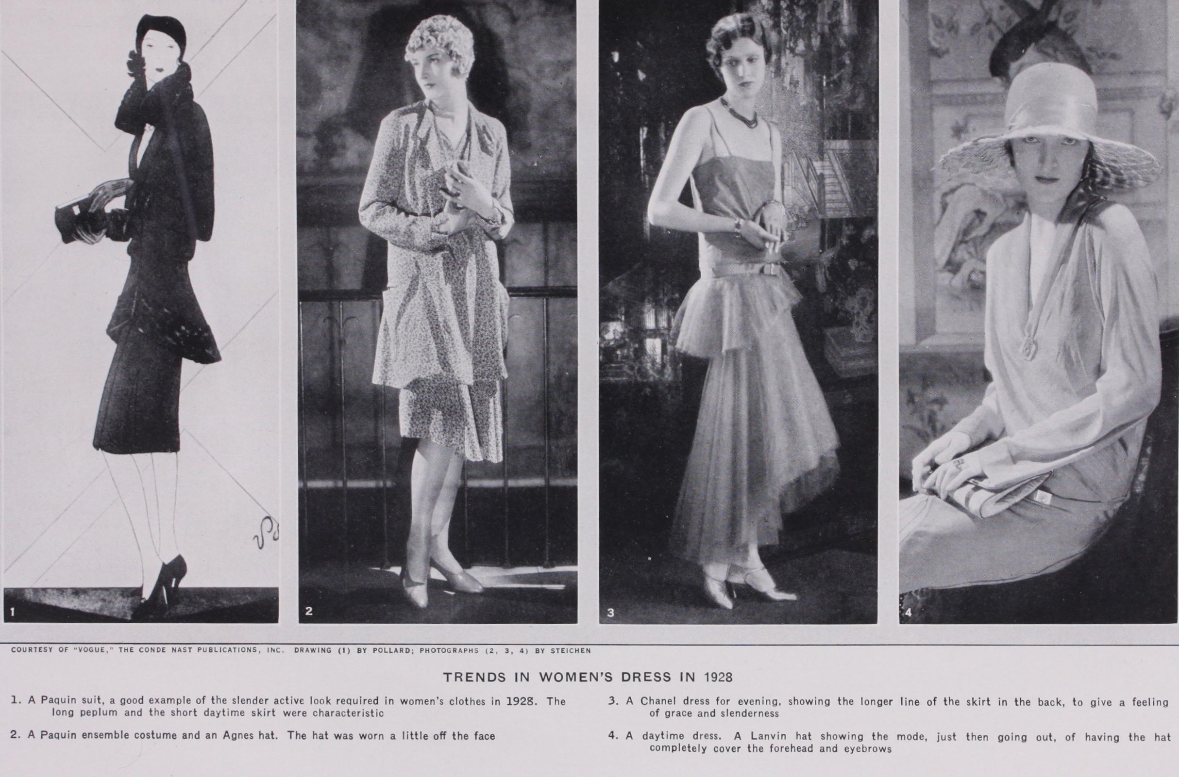 Many new materials were created in the last few years. Em broideries on plain materials gave way to printed materials ready for the making of the dress. New furs, feathers, kid, lizard and snake skins appeared on dresses. (R. DE T.-E.) Fashions from 1928 on.—With the arrival of 1928, the sil houette introduced a "flutter" to its hem line. The uniformity which had nearly reached a banal monotony during the preceding years changed during 1928 to a silhouette with a great deal of movement. The hem line began to dip in back until it almost reached the floor—particularly in evening gowns. During the day, the "sports" feeling, which had continually increased during each successive year, became even more marked. Physical exercise and intelligent diet had given the athletic figure of the modern woman a slender, active look; and rhythm had taken the place of heartiness. The hip line remained moulded—with a flat front and back—while the waist line, above, was felt rather than de fined. The longer line of the dresses in back succeeded in giving the feeling of grace and slenderness which had been very much lacking during the recent years. Hats which had completely cov ered the forehead and eyebrows were beginning to show them again. The introduction of what was known as "ensemble" be came even more important in 1928 for daytime wear.