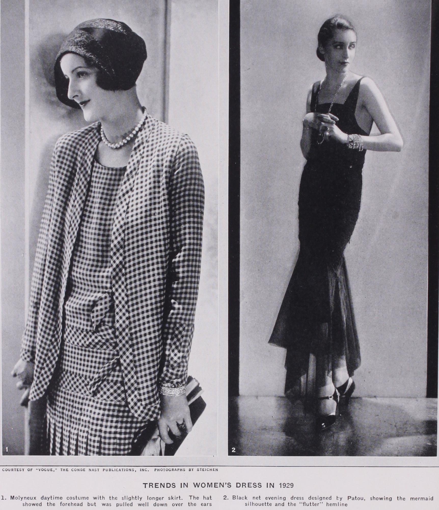 By 1929 the hat showing the forehead had arrived. The hem line continued to remain just below the knees in front, and flow ing to the floor in back. For evening, peplums over bouffant edi tions of the silhouettes appeared—made of taffeta and faille. Day clothes remained approximately the same as the preceding year. The hard silhouette of 1925 and 1926 was completely over thrown. The subtle beginning of the higher waist line and longer skirt line was, bit by bit, insinuating itself into being. Sports clothes became longer—four inches below the knee being the popular length. Trains on evening gowns appeared, giving even greater grace to costumes—but the skirt remained short in front. Clothes were again becoming complicated—almost fussy. The uniform sort of costume of 1925 was forgotten.