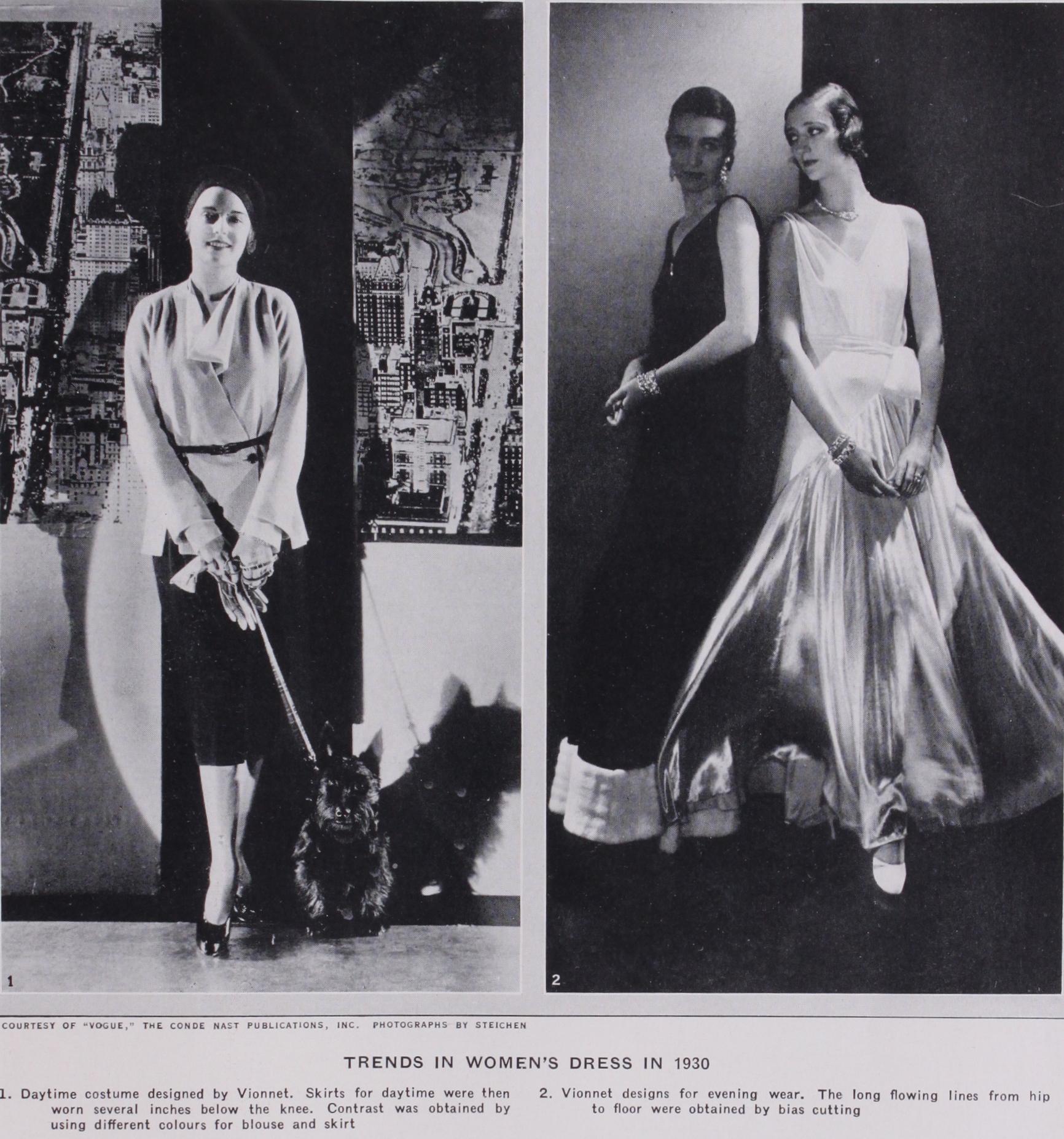 Confusion began with the introduction of the very first long skirts. Women became bewildered. They trailed these long skirts through the streets in the daytime. However, in the course of time, the novelty of the long skirt—so confusing to them at first —was gradually adjusted, and it assumed its proper place—which was for evening. The daytime skirt was worn seven or eight inches below the knee. Tea gowns and pajamas for entertaining at home were popular. A softer treatment for bobbed hair ruled. By 1930 the long-skirt had at last a sure foothold. The young so called "flapper" had become submerged. She had greeted as a new and exciting experience the feel of a long skirt swishing about her ankles—an experience which she had never felt. Her coats were fitted at the waist ; her slouch became dignified rhythm; and legs and knees were completely things of a recent past. Actually beauty of line began to appear. A Greek feeling appeared—a flowing from hip to floor for evening. Evening wraps became much longer—many of them reaching to the floor. The classical Greek line became the edict. "Brittle" lines—both for evening and day—assumed a flowing movement. These last ten months were the most confusing for both women and dressmakers in ten years. The complete and revolutionary change of after-war severity had been one of turmoil and re-adjustment.