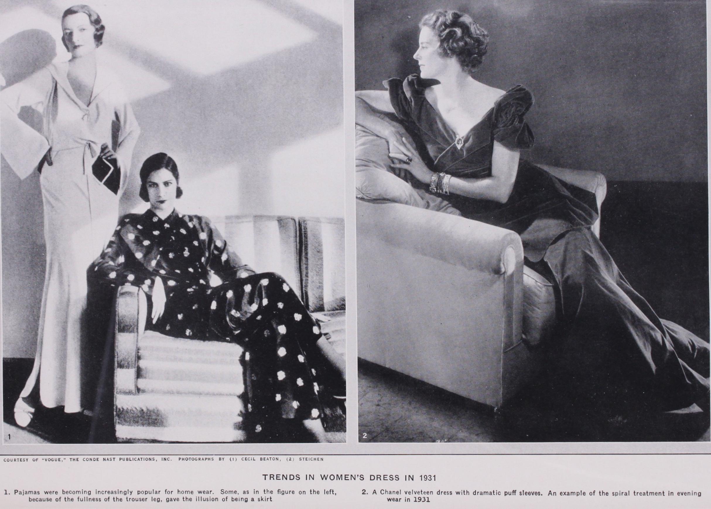 1931 ushered in a very graceful and flattering era of spiral treatments in evening dresses. These dresses clung to the figure and the women of 1931 suggested the classical figures on a Greek frieze. The pajama had become overpoweringly popular. During the summer at the watering places of the world the pajama was worn almost continuously, both for daytime and evening. Some times the evening pajama—because of the fullness of the trouser leg—gave the illusion of being a skirt. The motion picture had begun its powerful influence, and women were dramatizing their clothes far more than they ever had before. Dramatic clothes were no longer seen only on the actress. Ladies in the audience were equally exciting in their dress and frequently more so than their favourite star. Inhibitions about colour were being abolished. Gaiety, undoubtedly a reaction from the drabness of more recent years, became the exciting gesture of the day. The financial crisis had caused a rather clever pseudo bravado. It was considered chic to be poor. Wealth was changing hands. Many of the smart women of the day were financially curtailed. Fewer clothes were in once overflowing wardrobes. This seemed to give an added im pulse to inventive designers, and each month new ideas were offered. Fashion, unlike in its earlier history, changed almost fortnightly. The continual desire for something new, partly be cause of promotion in the great shops of the world, and because of the variety of ideas in the cinema and dressmaking houses, made a perpetual fireworks of ideas and variety of design during these latter years.