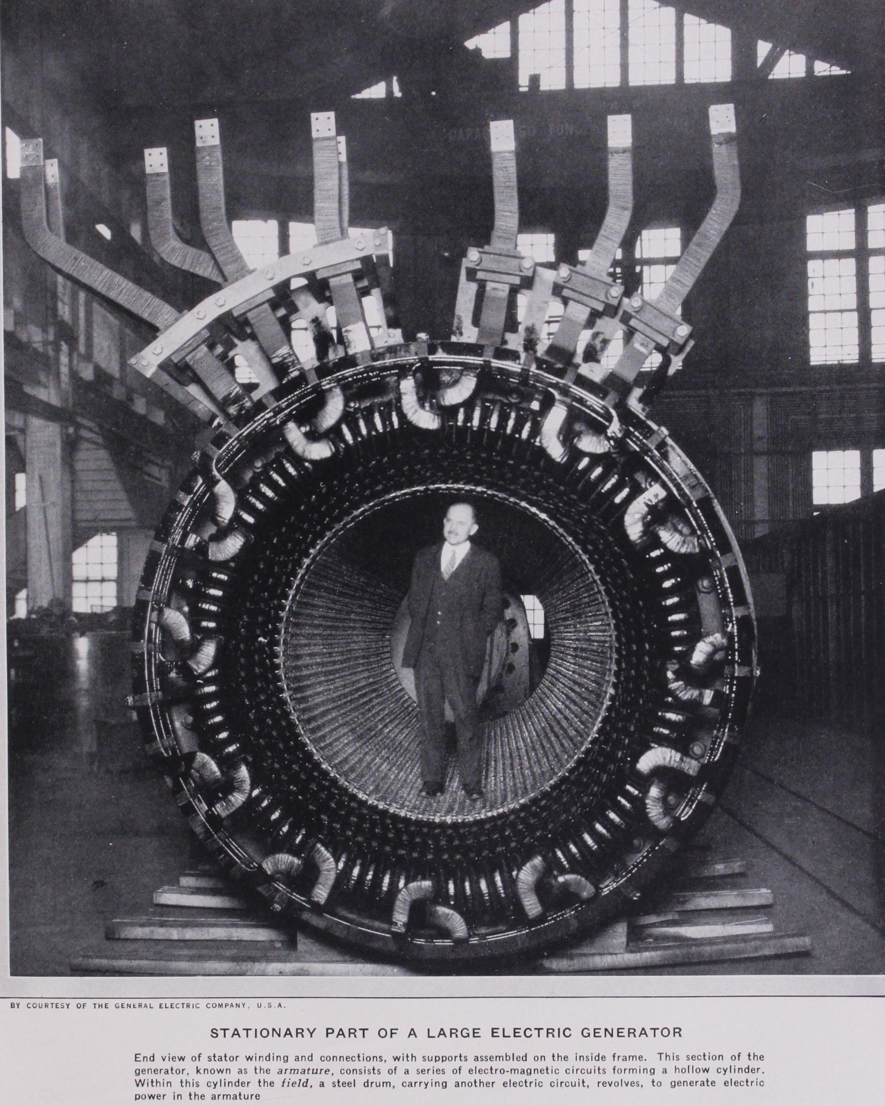 ELECTRIC GENERATOR, a machine that converts mechanical into electric power, as the result of the continuous motion of a system of electrical conductors across a magnetic field. The term "dynamo," formerly used widely to designate an electric generator or motor, is now obsolescent. In general, a gen erator consists of a field, comprising a series of alternate north and south magnetic poles spaced around a circular periphery, and of a concentric armature built of laminated steel and carrying a system of electrical conductors at its surface, together with a mechanical structure that permits the field to be revolved with respect to the armature by external means, either armature or field being held stationary in particular cases. The armature con ductors are so connected that the voltages induced by their passage across the magnetic flux from the field poles are additive. The field poles are magnetized by electric currents passing through one or more encircling coils, called the field winding.