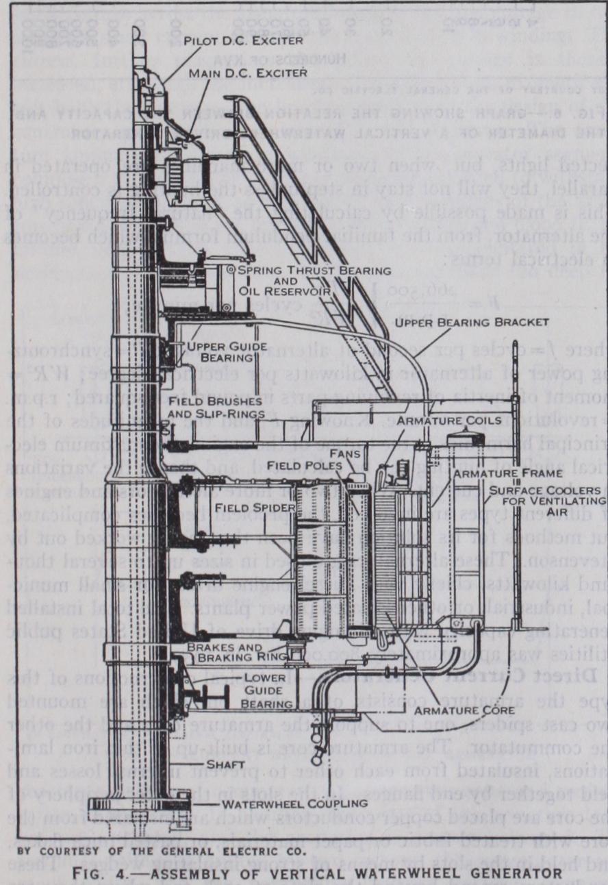 Waterwheel Driven Alternators.—A cross section of a typ ical large waterwheel driven alternator is shown in fig. 4. Such machines have been built with horizontal shafts, and for very high head plants they are still made, but vertical shafts are employed in almost all recent installations, thus securing better utilization of the full head of water. The weight of the rotor and downward thrust of the water are usually carried by a thrust bearing at the upper end of the shaft, while guide bearings above and below hold the rotor in a central position. Such thrust bearings carry loads of about 40o pounds per square inch, and are cooled by immersion in oil. The field normally revolves, inside the stationary armature. The armature frame was formerly made of cast iron, but since 1925 there has been a marked trend toward built-up frames of welded steel plates. The weight of the thrust bearing is supported by upper bearing brackets resting on the outer rim of the stator frame. The central rotor structure, or "spider," has generally been made from steel castings, but present tendencies are toward the use of built-up structures of steel plate. The rim frequently "floats" on the spider arms, the arms merely taking the weight and the torque, leaving the rim free to expand radially under thermal and centrif ugal stresses. Such a separation of the functions of rim and arms enables each to be designed to withstand definite stresses, whereas when arms and rim are integral, the division of stress is indeter minate, and larger factors of safety are required. The rim is then generally made of segmental overlapping punchings held together by through pins and attached to the spider arms by rectangular keys. The "salient" field poles are held on dovetails fitting into slots in the rim, or, in low speed machines, by radial bolts passing through the rim. As most waterwheels will attain nearly double normal speed if full load is dropped, and the water is not shut off at once, the generator rotor must meet severe overspeed tests, and so its mechanical design is of the greatest importance. The field winding is most economically made with one coil per pole. On large machines, the field coils are made of edgewise wound copper strip, insulated by varnished paper between turns ; but wire wind ings are employed on small machines. Generally the field current is supplied by a direct current "exciter" mounted on the same shaft. As some water may leak through the closed turbine gates, it is necessary to supply brakes to stop and hold the generator rotor at rest, when it is taken out of service. These are mounted below the rotor, and a separate "braking ring" should be provided on the lower end of the rotor spider, which can withstand the extreme heat that may be generated. Ventilation is provided by air drawn in between the poles from the ends and blown out through radial air ducts in the stator.